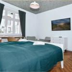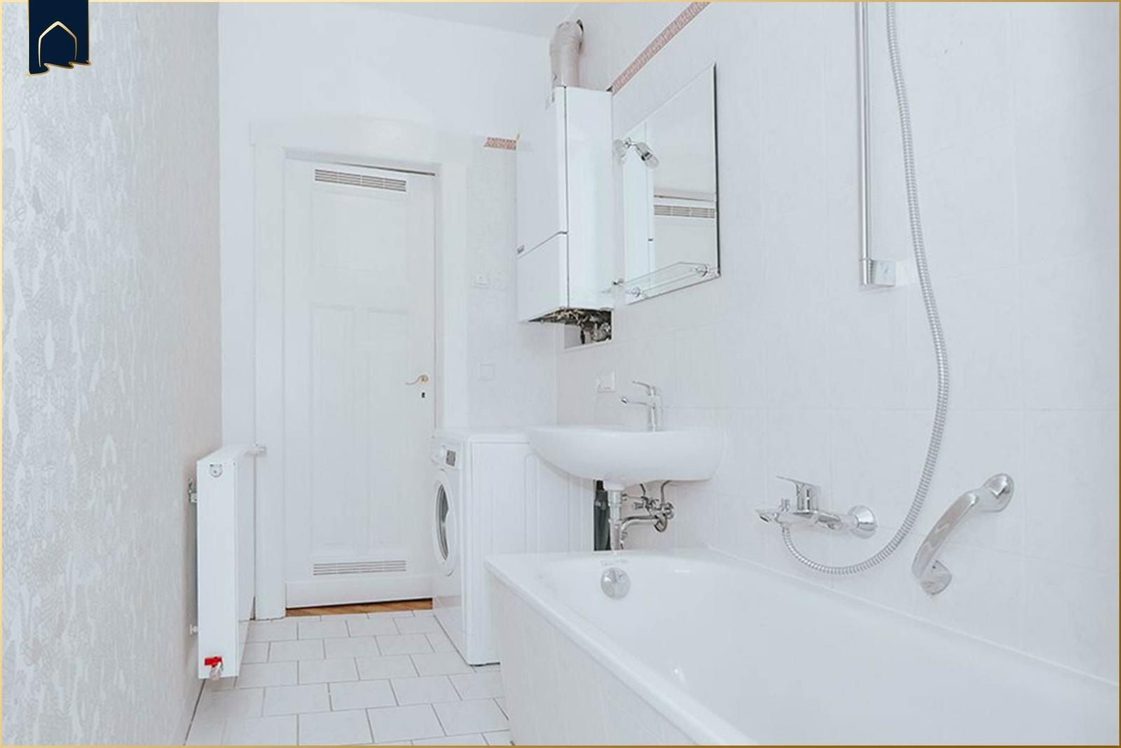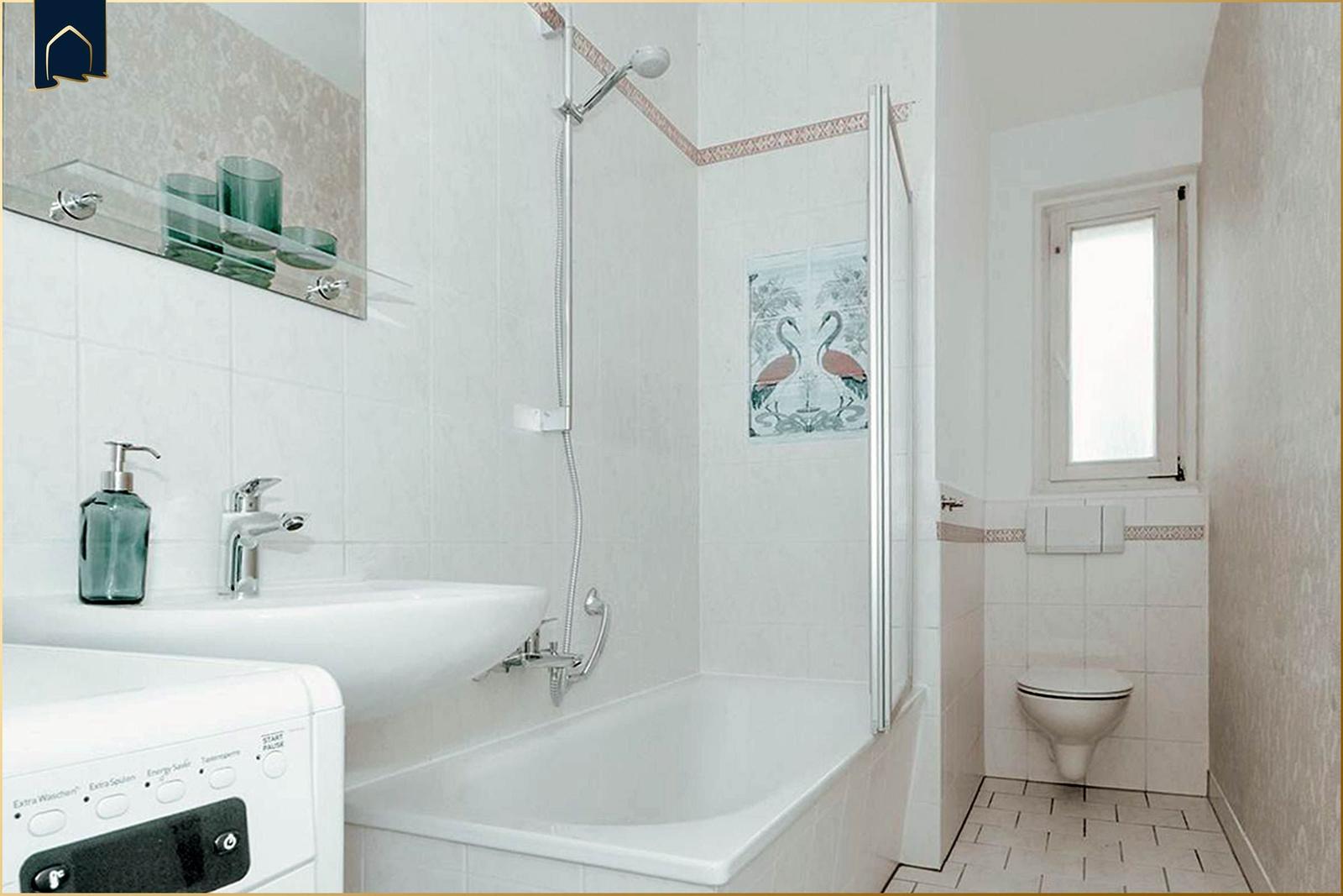 The living area includes a TV and a cozy seating area with armchairs, ideal for relaxation. A designated dining space with an eat-in table is perfect for enjoying meals together. Additional amenities include a washing machine, kettle, and a variety of kitchenware. A designated parking space adds to the convenience. The bathroom features a bathtub and a mirror for added comfort. Overall, this apartment combines functionality and comfort, making it an excellent choice for a memorable stay.