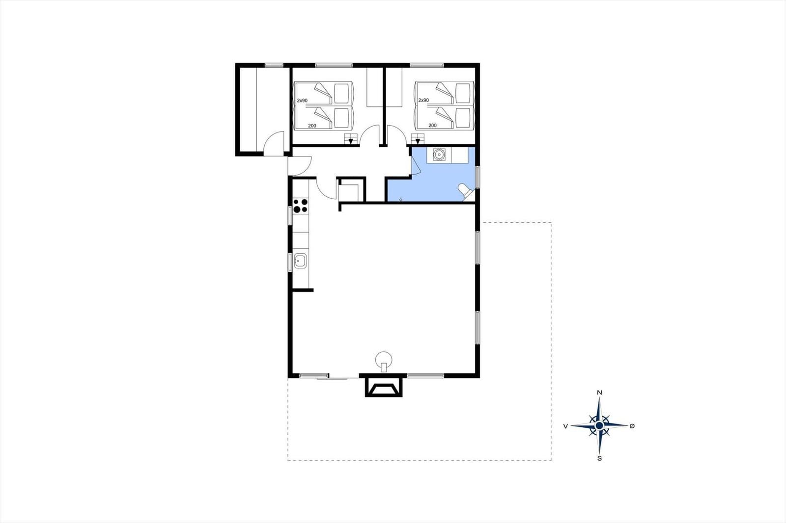 The living area features a cozy arrangement with a fireplace, inviting furnishings, and a Smart TV with Danish and German channels, including Chromecast. The open-plan kitchenette is fully equipped with a dishwasher, electric/gas stove, oven, microwave, refrigerator, freezer, and coffee maker, allowing for convenient meal preparation. Two comfortable bedrooms with double beds and a sofa bed provide ample sleeping arrangements, complemented by a modern bathroom with a shower.