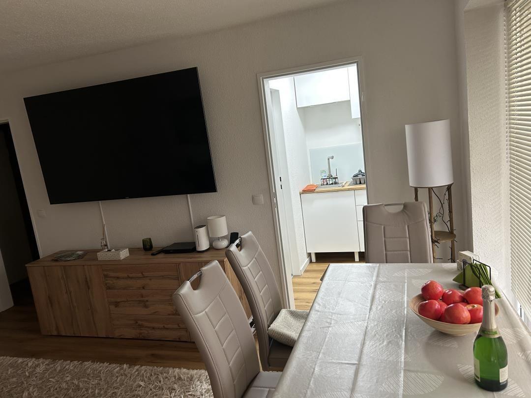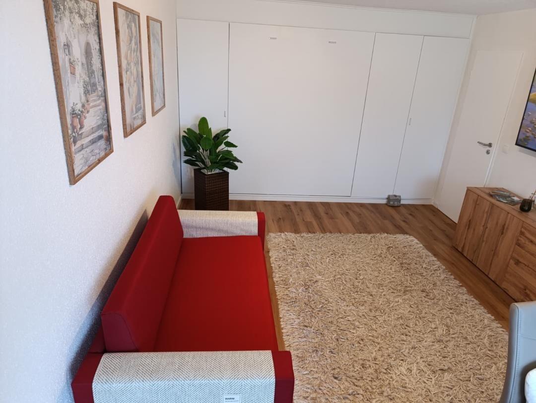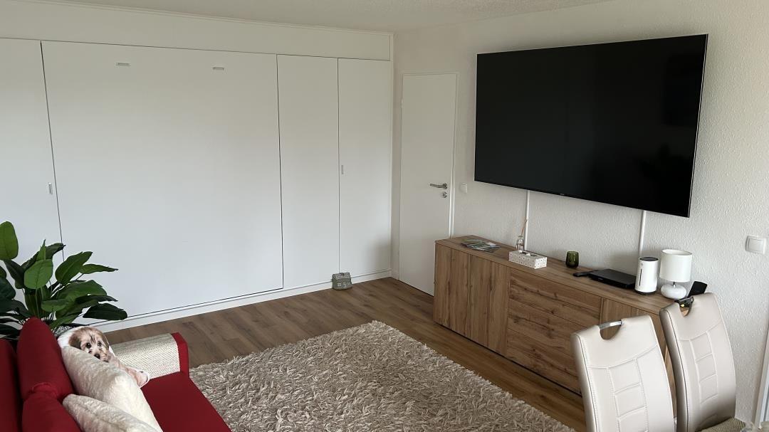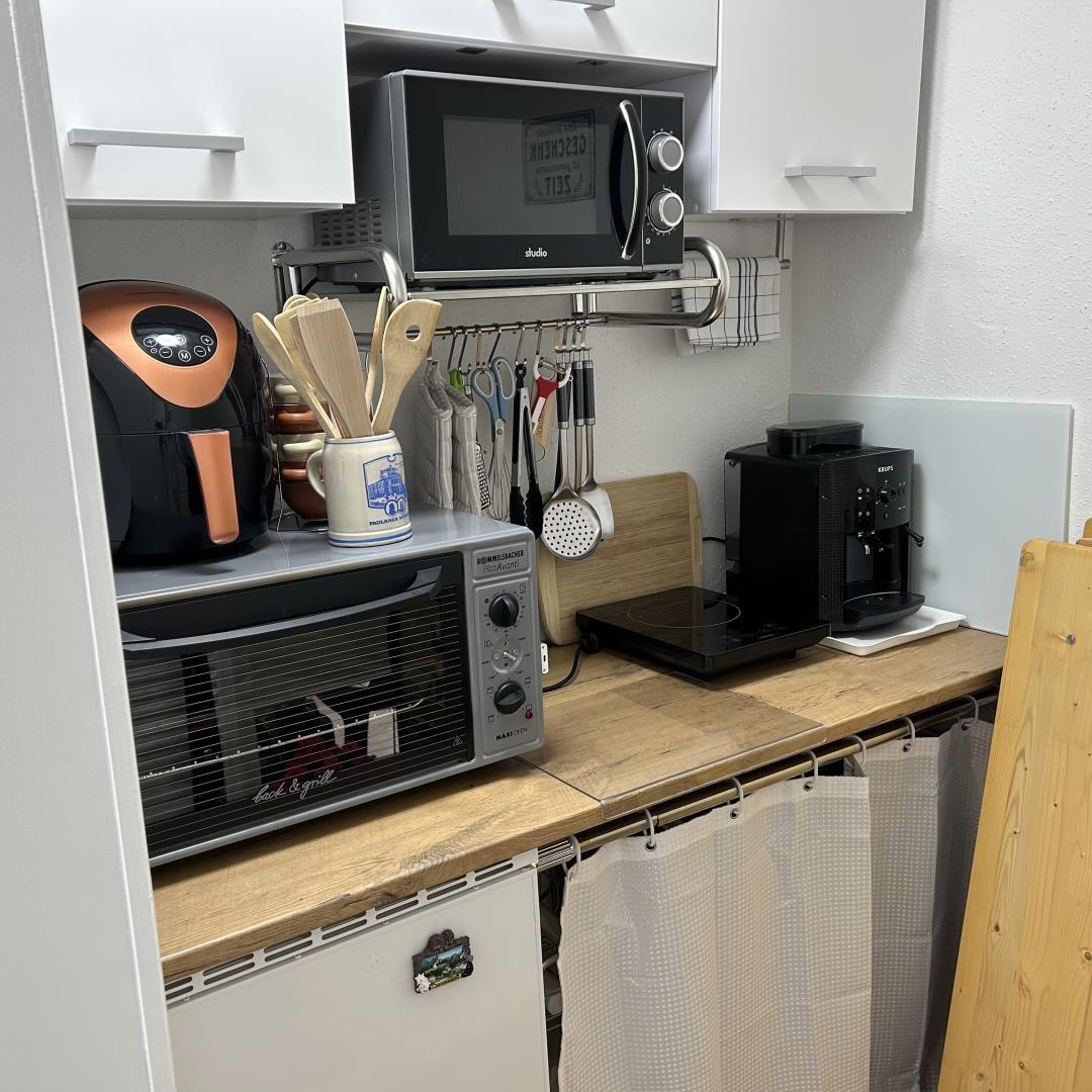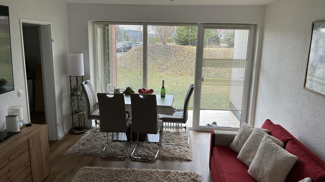 This cozy ground-floor apartment impresses with its inviting terrace and particularly convenient location directly next to the main entrance and parking area. Upon entering, one is welcomed by a practical foyer, leading into a bathroom equipped with a toilet and a bathtub. The combined living and sleeping area offers maximum flexibility, featuring a high-quality wall bed and a sofa bed for restful nights. A dining table with four chairs invites guests to enjoy meals together. The well-equipped kitchen is ideal for daily use as well as longer stays, with amenities including a bean coffee machine, air fryer, freestanding large pizza oven, microwave, single induction cooktop, kettle, toaster, and refrigerator with freezer compartment, with sufficient utensils for four people. Bed linen and towels are included in the rental price, ensuring a comfortable stay.