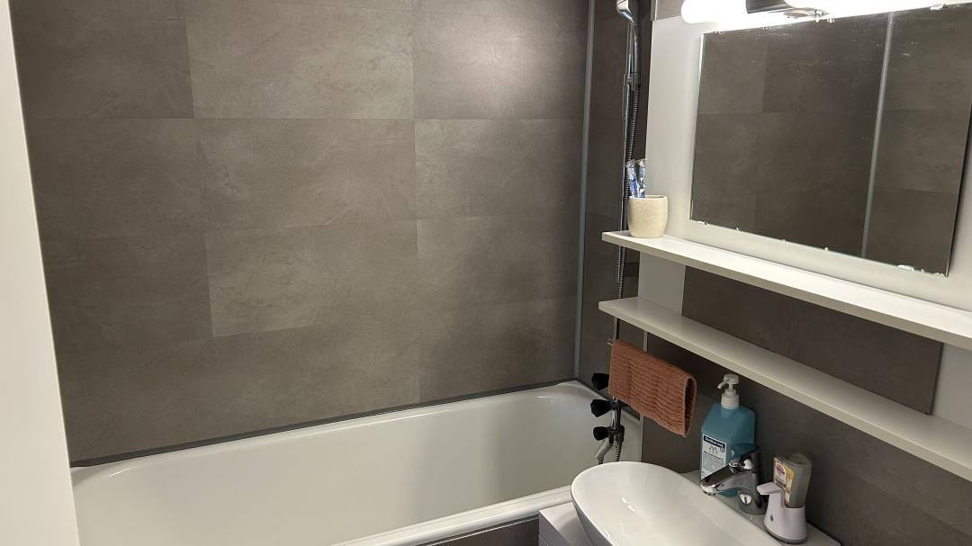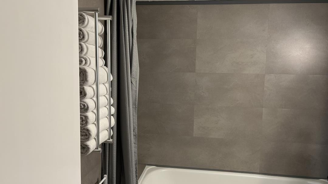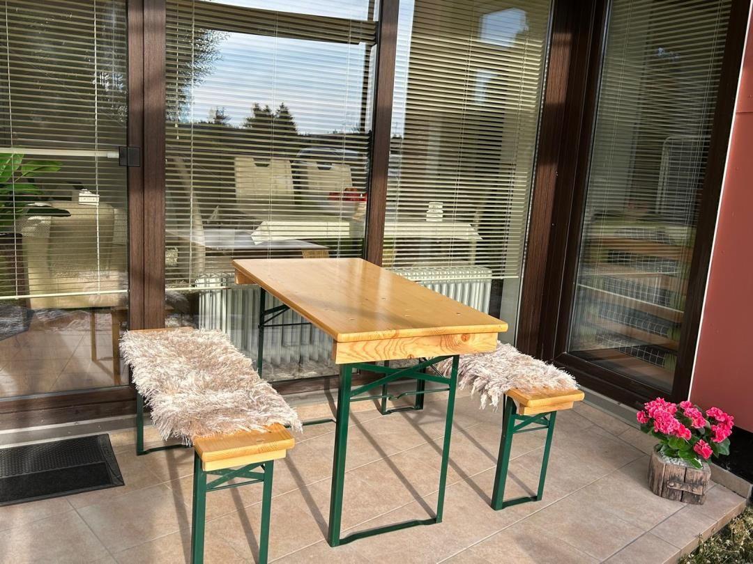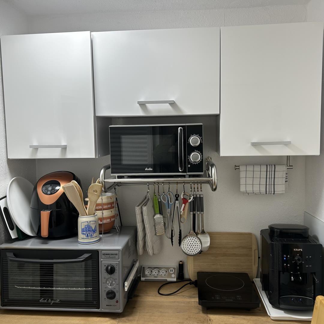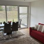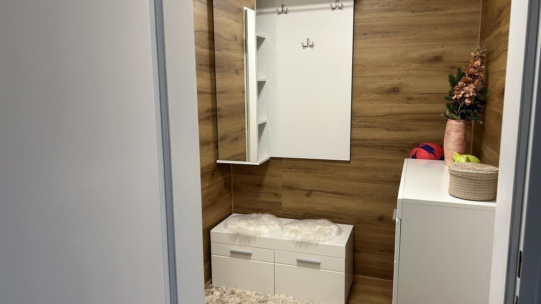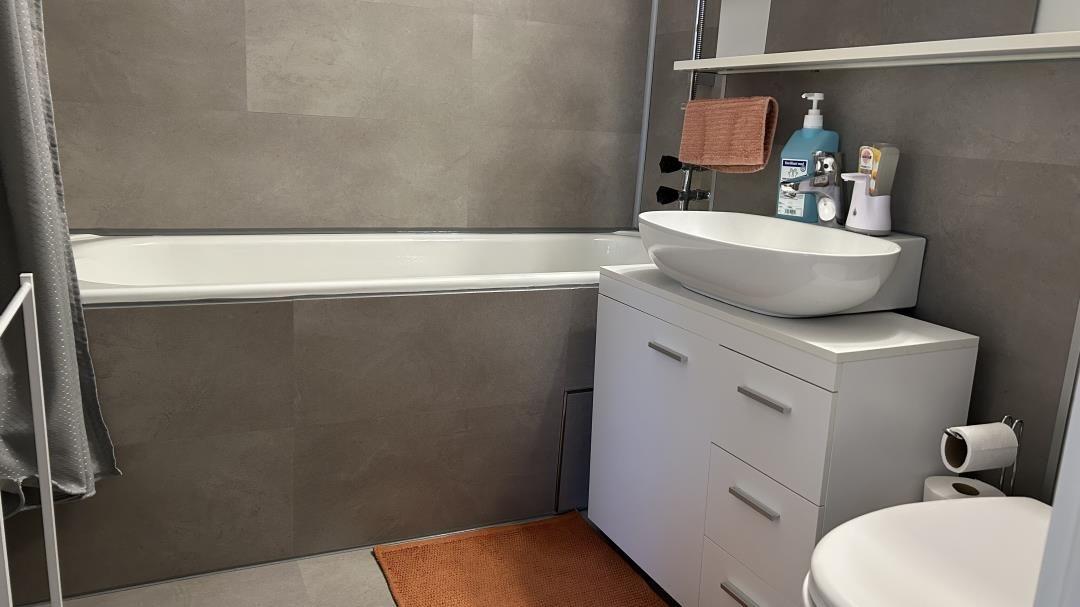 This cozy ground-floor apartment impresses with its inviting terrace and particularly convenient location directly next to the main entrance and parking area. Upon entering, one is welcomed by a practical foyer, leading into a bathroom equipped with a toilet and a bathtub. The combined living and sleeping area offers maximum flexibility, featuring a high-quality wall bed and a sofa bed for restful nights. A dining table with four chairs invites guests to enjoy meals together. The well-equipped kitchen is ideal for daily use as well as longer stays, with amenities including a bean coffee machine, air fryer, freestanding large pizza oven, microwave, single induction cooktop, kettle, toaster, and refrigerator with freezer compartment, with sufficient utensils for four people. Bed linen and towels are included in the rental price, ensuring a comfortable stay.