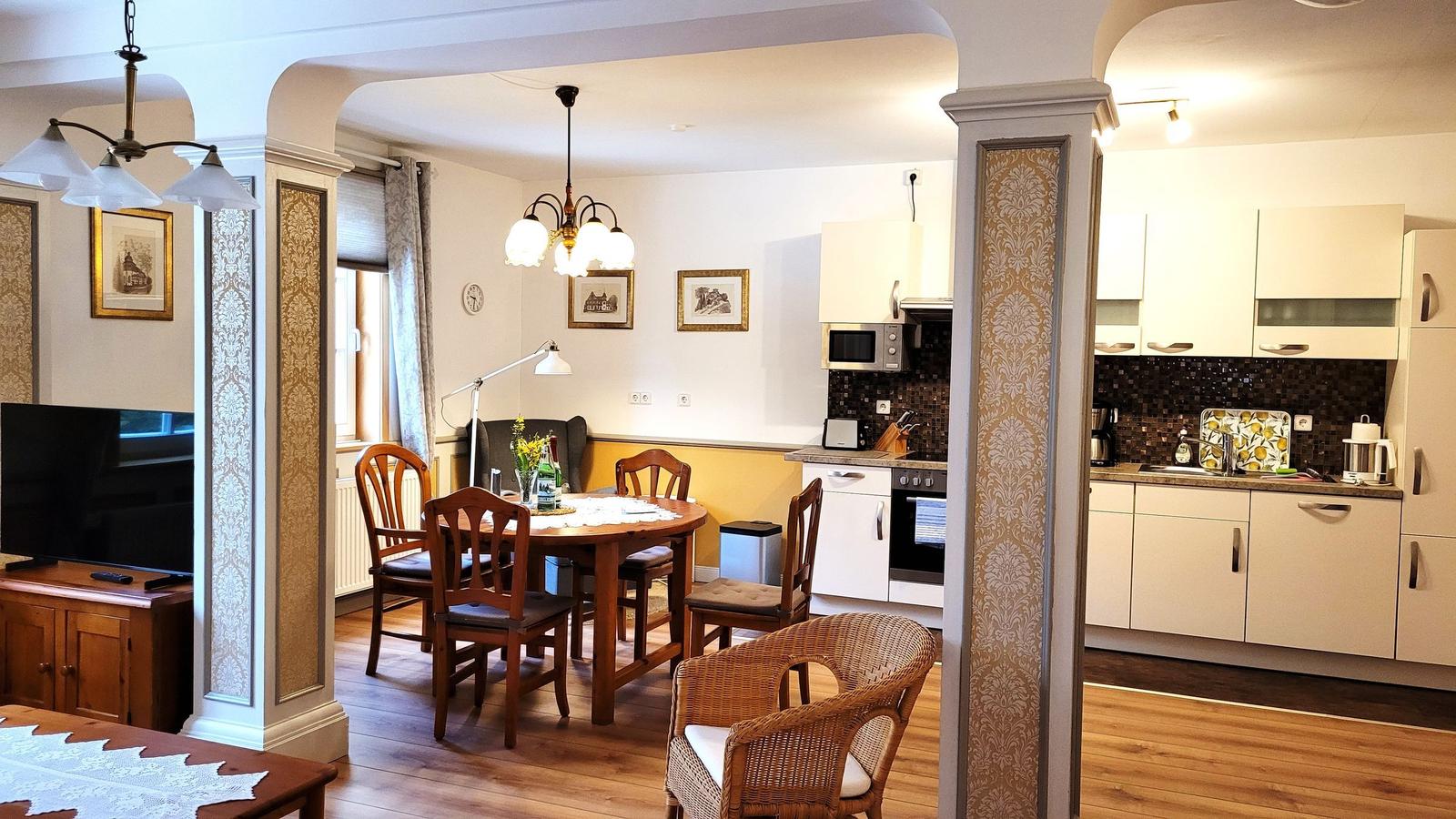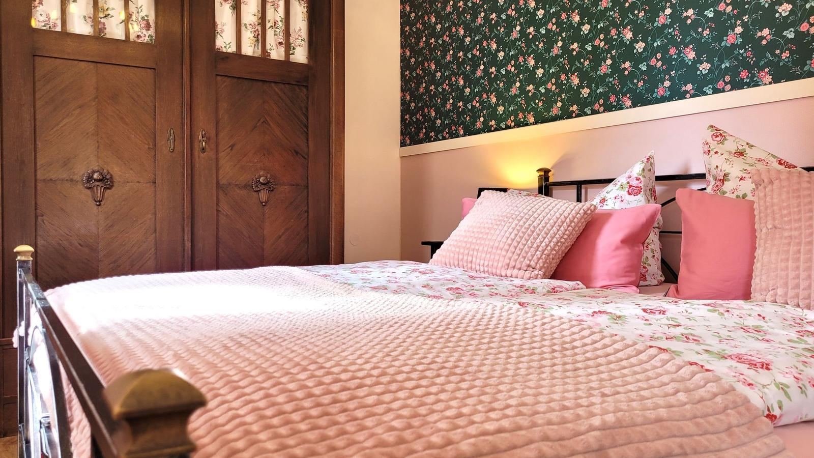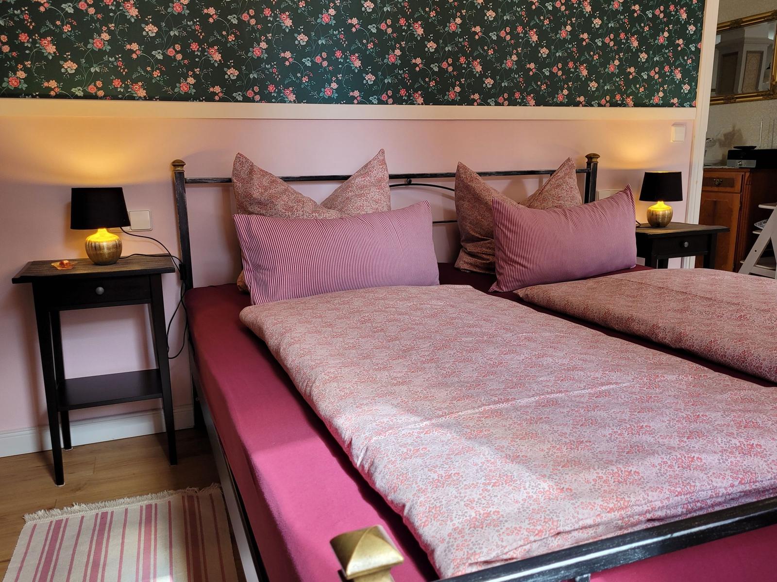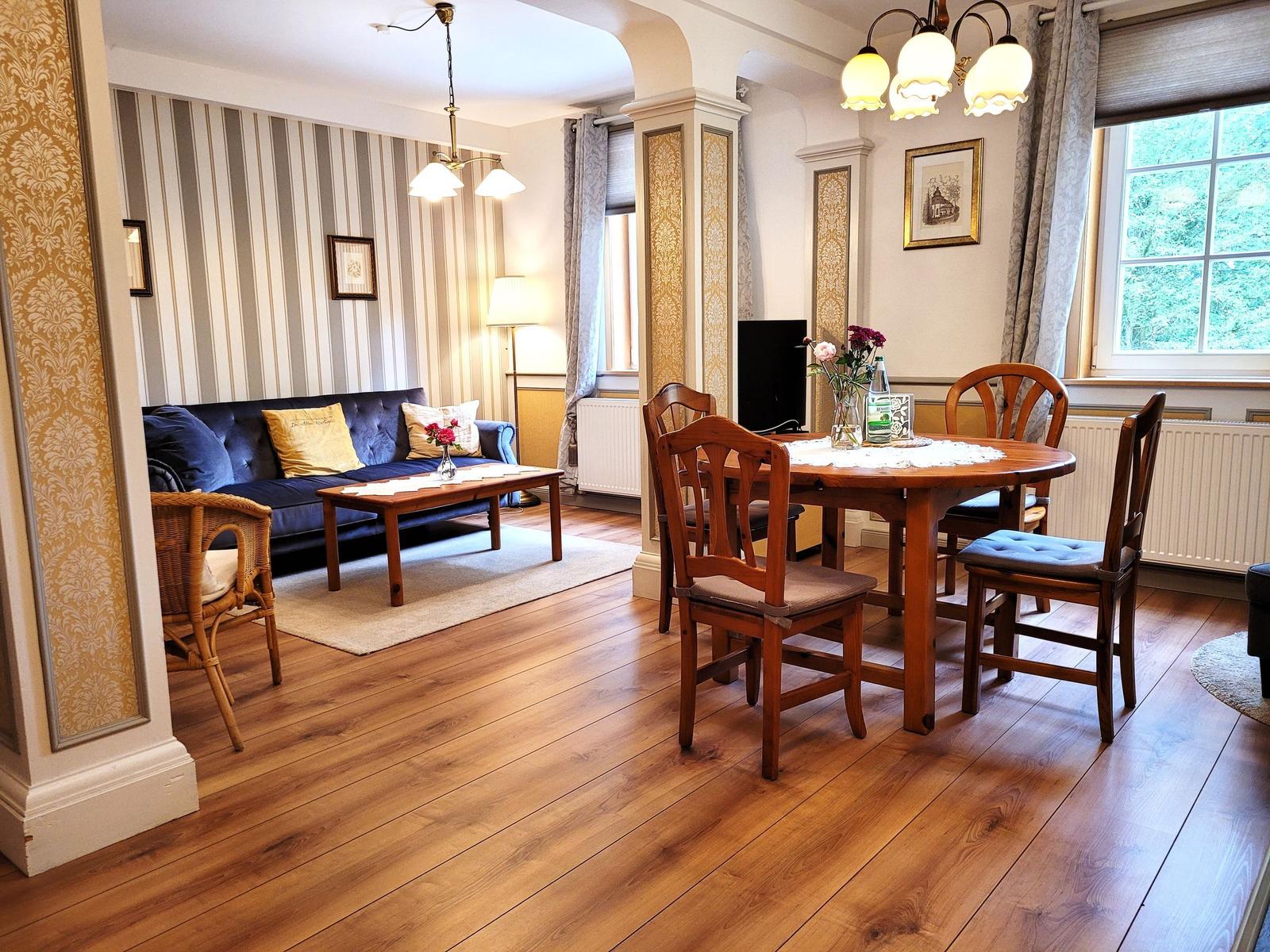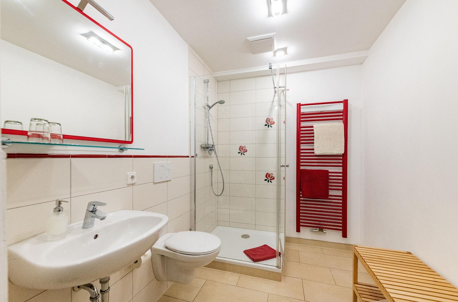 Welcome to the "Ratssaal" vacation apartment, located in the historic "Old Town Hall" of Bad Liebenstein. Spanning 60 m², this romantic retreat features charming historical column elements, adding to its unique allure. The beautifully decorated bedroom, adorned with rose motifs, invites restful nights, while the modern bathroom boasts a stylish glass shower with rose accents.