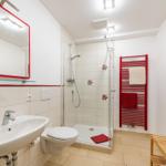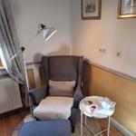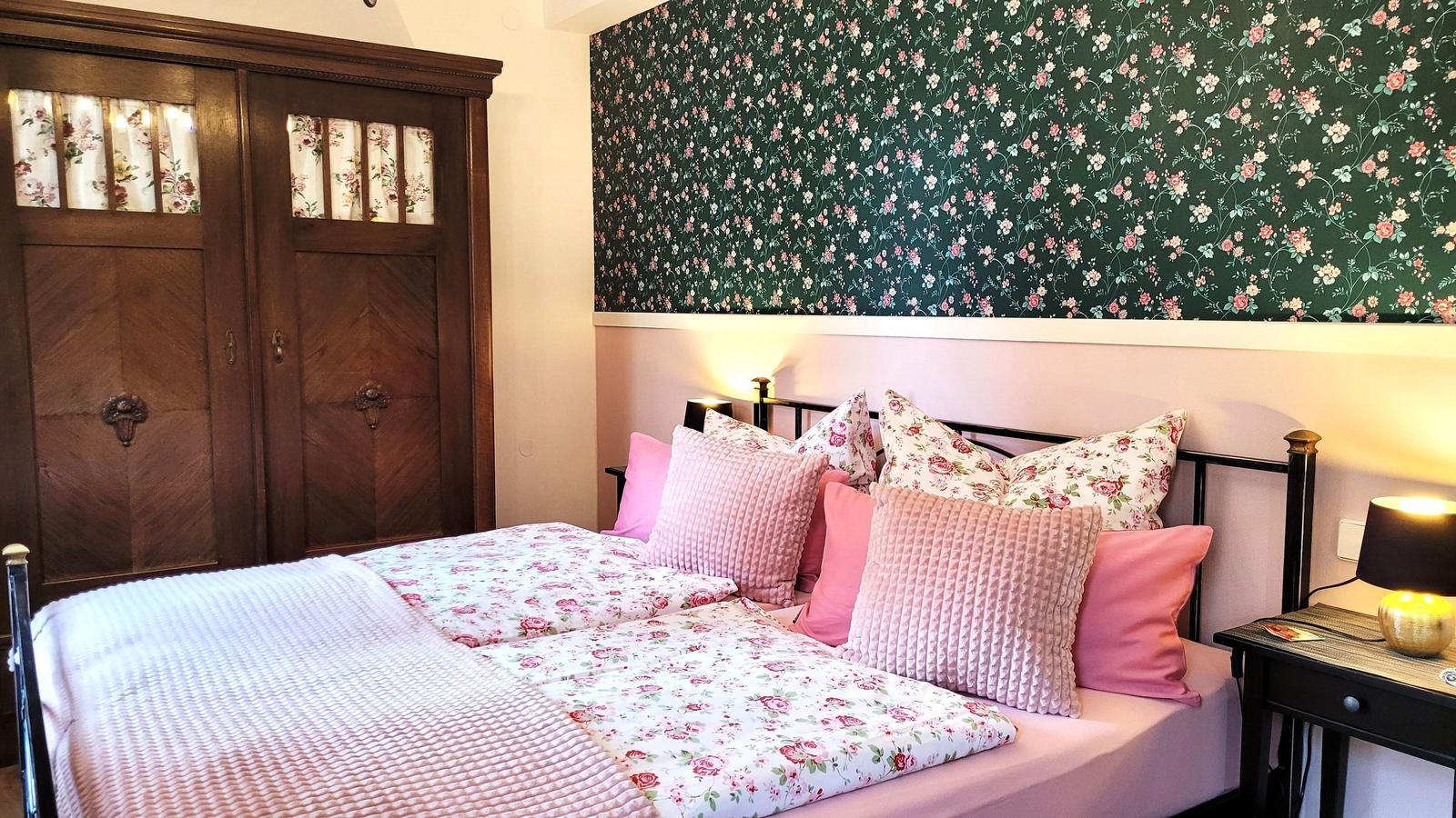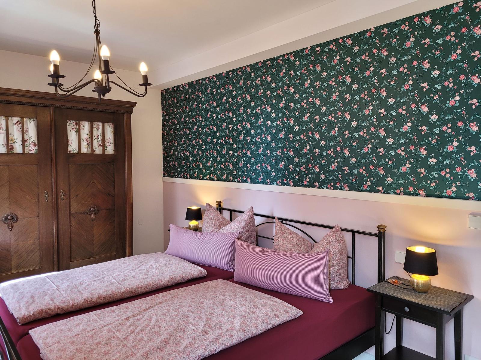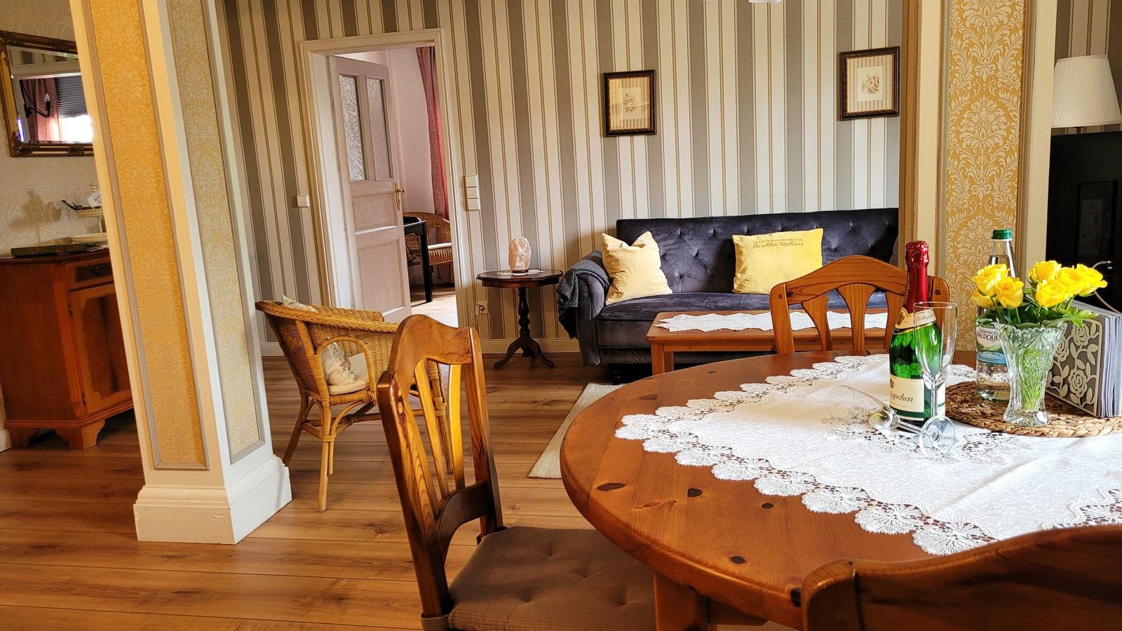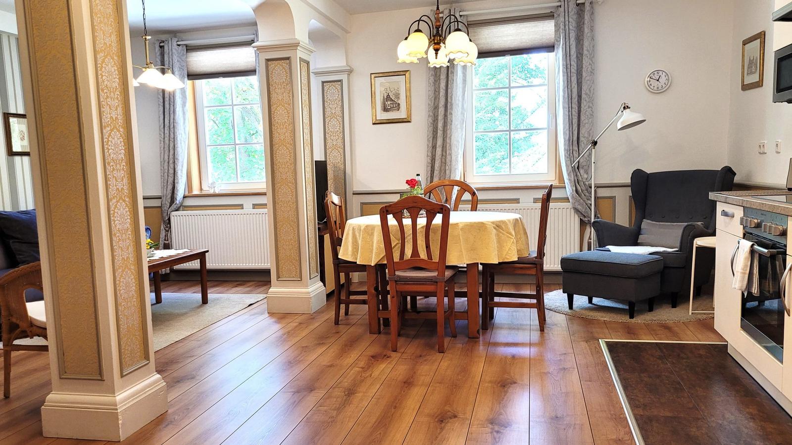 Welcome to the "Ratssaal" vacation apartment, located in the historic "Old Town Hall" of Bad Liebenstein. Spanning 60 m², this romantic retreat features charming historical column elements, adding to its unique allure. The beautifully decorated bedroom, adorned with rose motifs, invites restful nights, while the modern bathroom boasts a stylish glass shower with rose accents.
