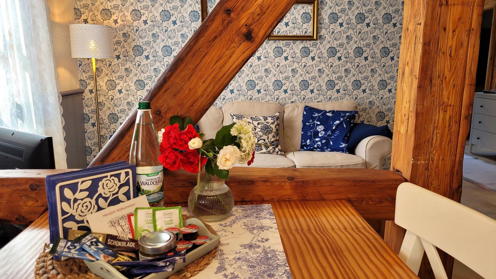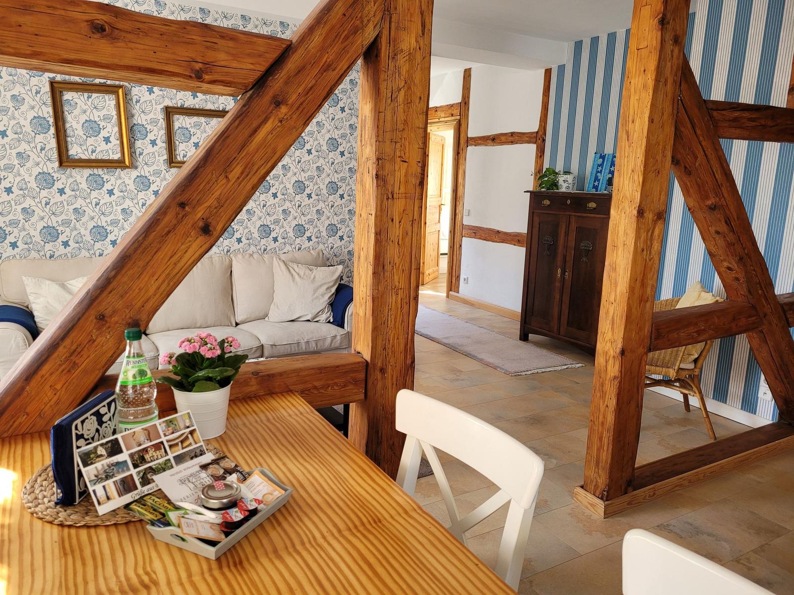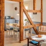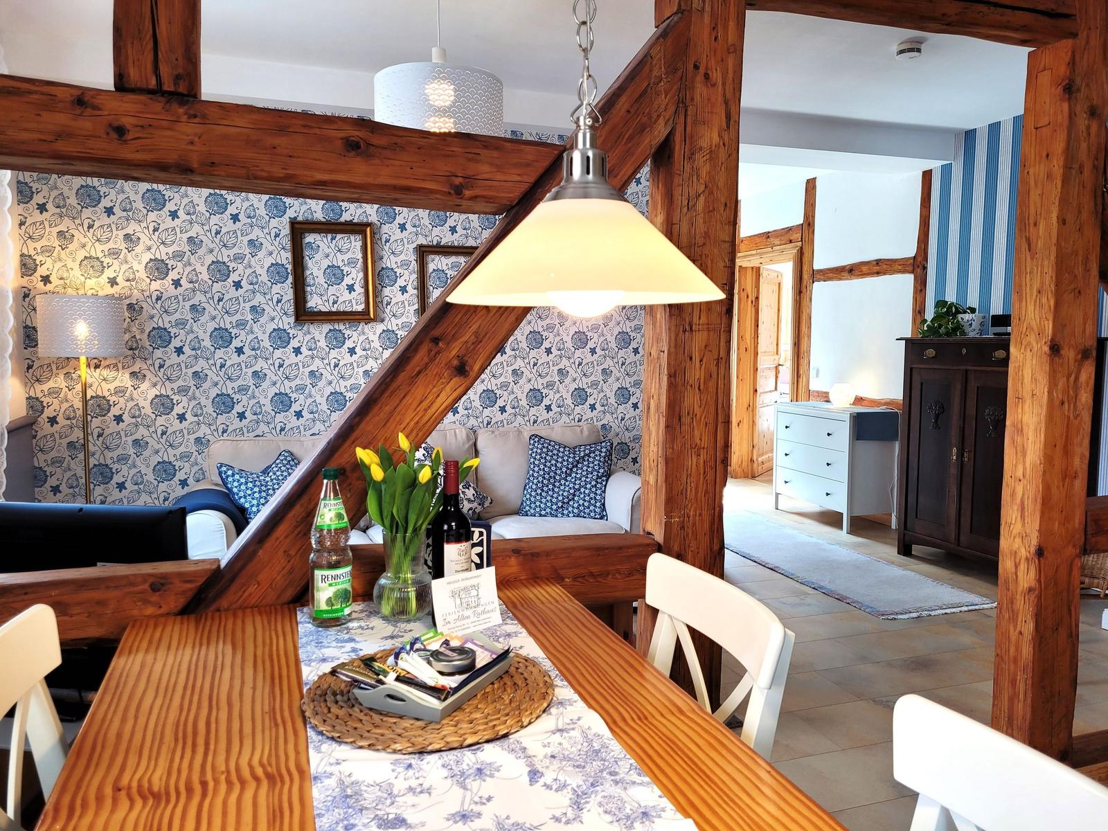 The vacation apartment, located in the historic "Alte Rathaus" of Bad Liebenstein, offers a prime central location on Herzog-Georg-Straße, one of the main streets of this charming spa town in the Thuringian Forest. Surrounded by historic buildings and delightful cafés, guests can immerse themselves in the unique atmosphere of the oldest spa in Thuringia.