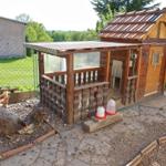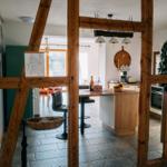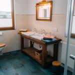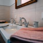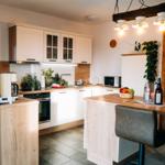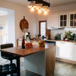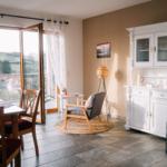 The open-plan, fully equipped kitchen in a modern country style is ready for meal preparation, complete with a dishwasher, microwave, and oven. A generously sized bathroom highlights a custom double sink and spacious shower, enhancing the inviting atmosphere.