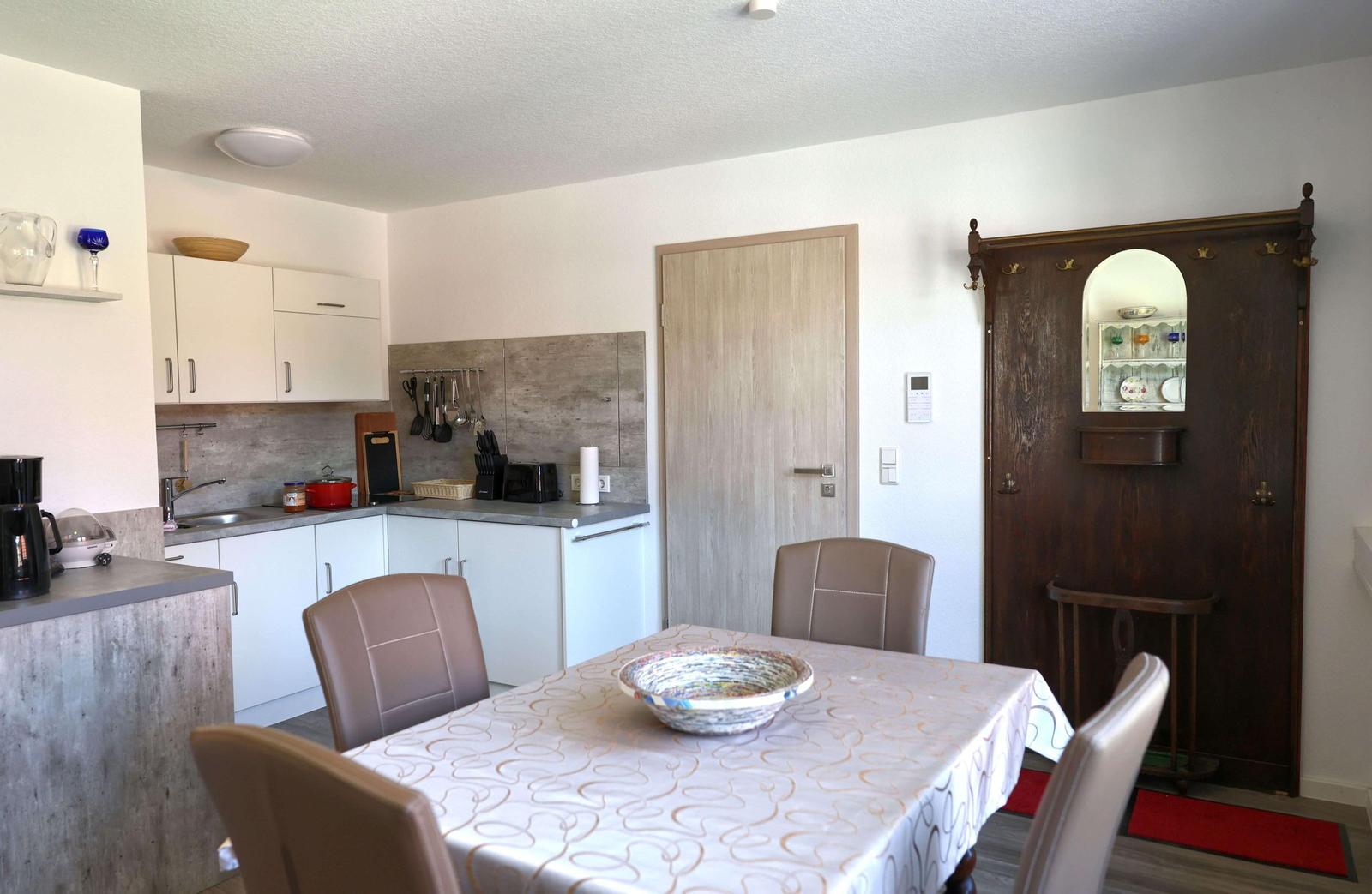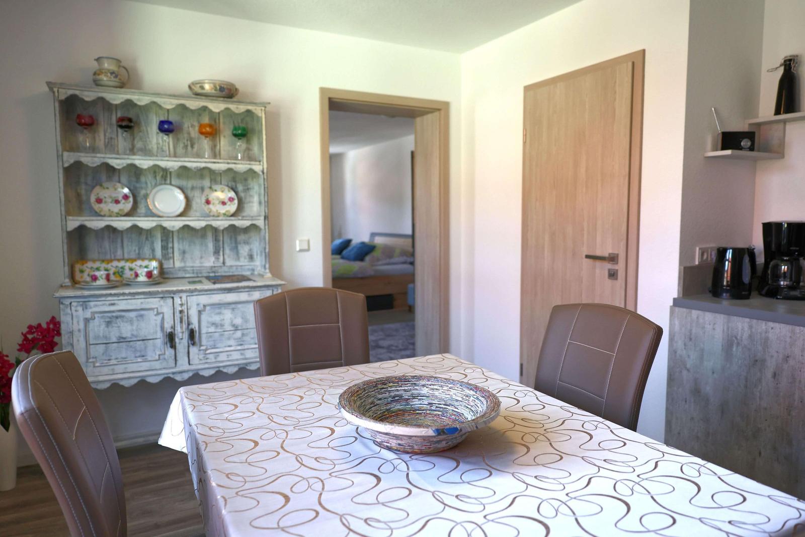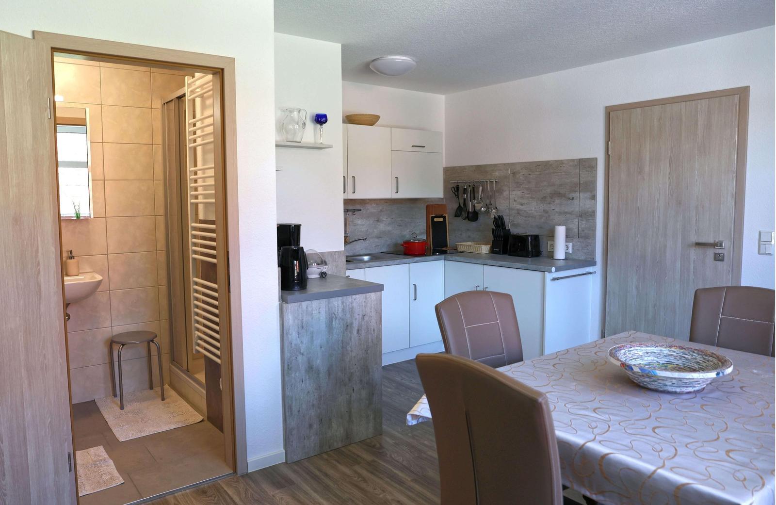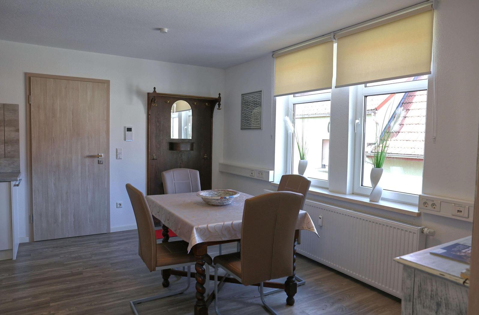 The vacation apartment "Zur Sonne," located in the historic inn in Schweina, offers a charming retreat infused with history and modern comfort. Positioned on the first floor, the freshly designed space combines rustic style with contemporary amenities. The entrance leads directly to a cozy dining area featuring a well-equipped kitchenette, perfect for preparing meals. The separate bedroom includes a comfortable bed, a stylish sitting area with two armchairs, and artwork by local artist Simone Dittmar, enhancing its unique charm. The compact bathroom is functional and includes a shower, WC, and hairdryer. An extra child’s bed can be provided upon request. Guests can enjoy free parking either in the backyard or at the nearby supermarket, just 100 meters away. This apartment is ideally suited for couples, solo travelers, or small families seeking relaxation amidst the natural beauty and culture of the Thüringer Wald. Check-in is available from 3:00 PM, and check-out is until 11:00 AM.
