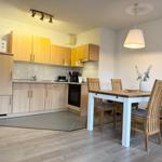 The holiday apartment offers a spacious and well-equipped retreat. With one bedroom featuring a comfortable double bed and a stylish living room with a sleeping couch, it accommodates various needs. The open kitchen is a highlight, complete with modern appliances including an electric/gas stove, oven, microwave, and refrigerator, ensuring effortless meal preparation. Guests will find a coffee maker, toaster, and a freezer for added convenience.