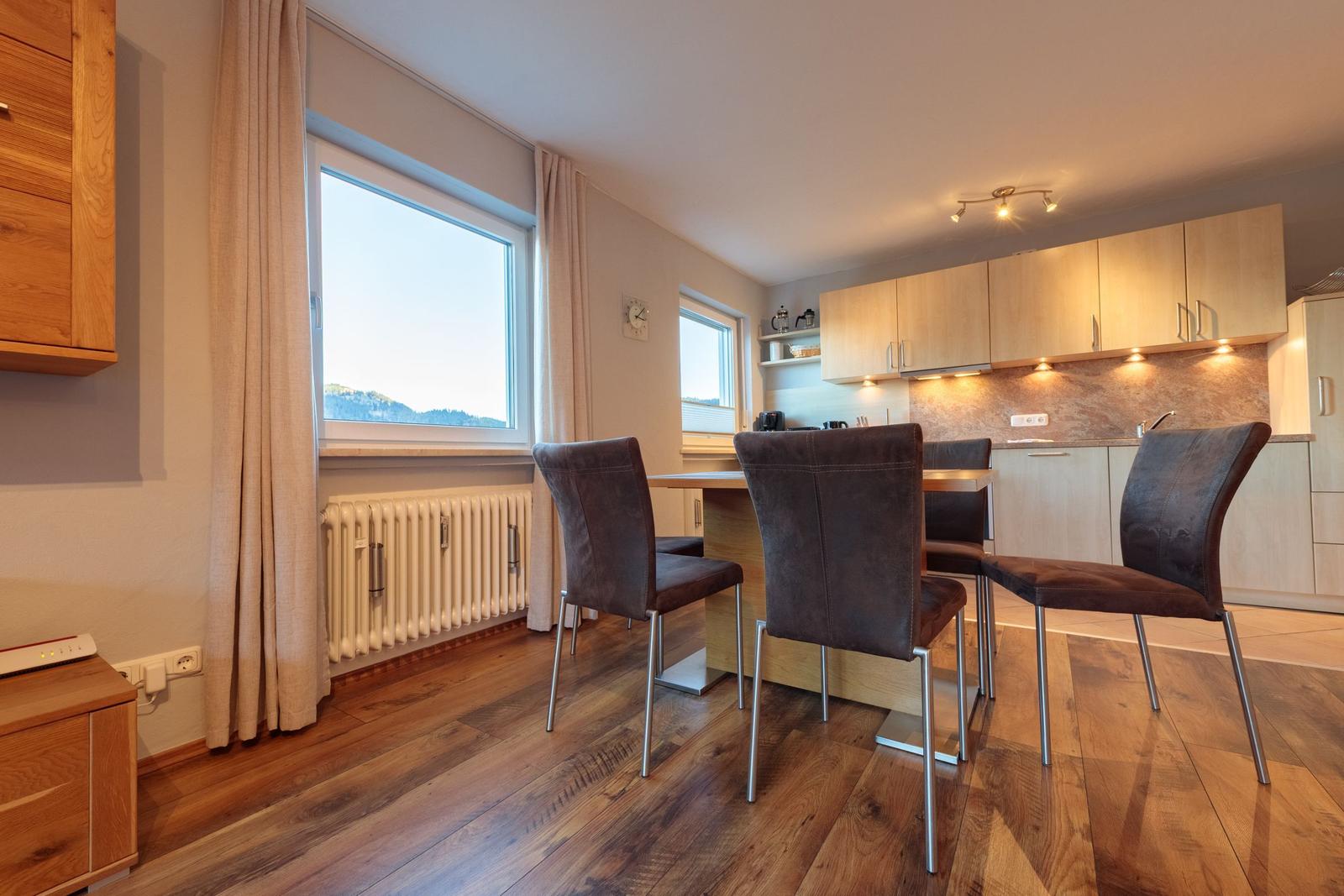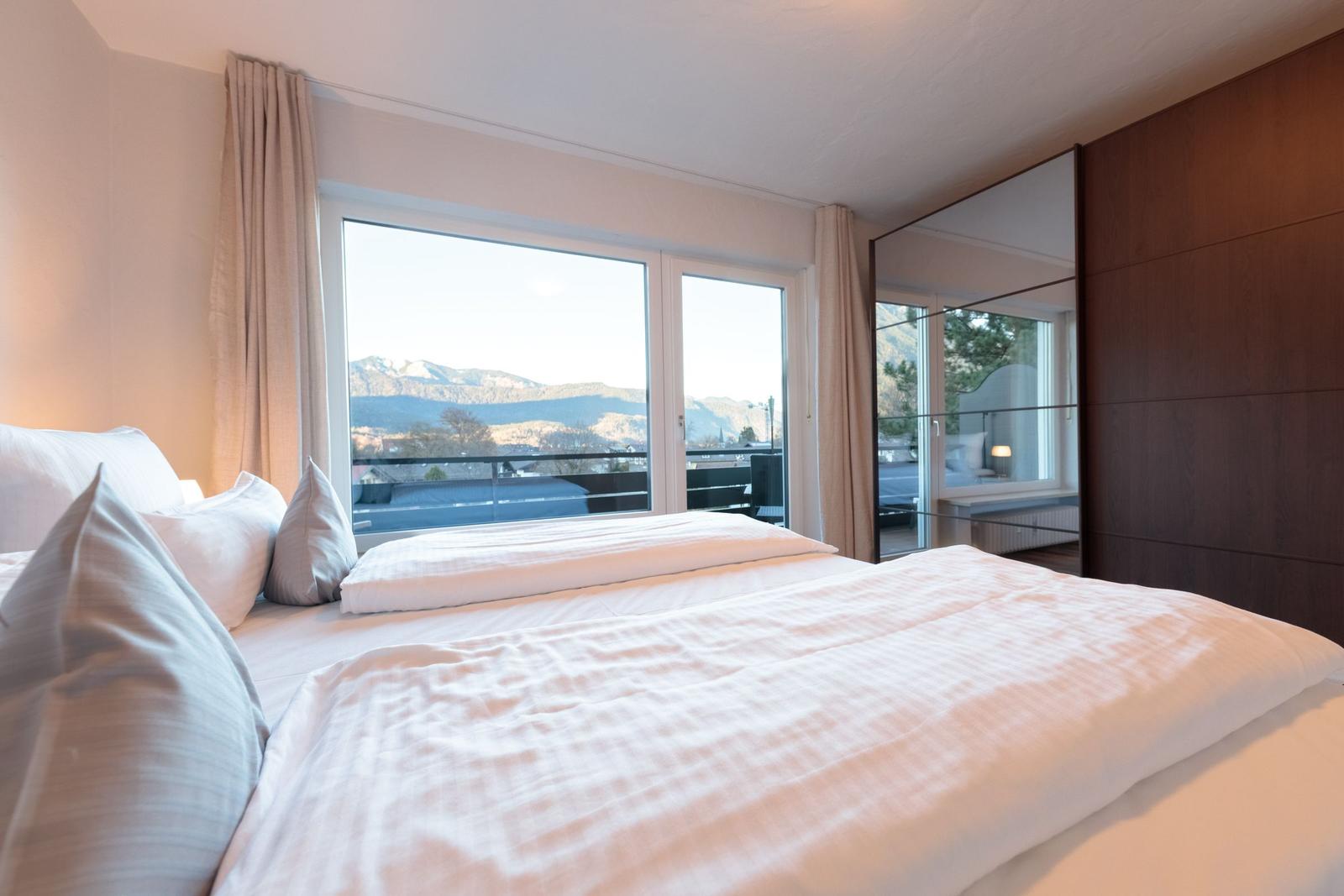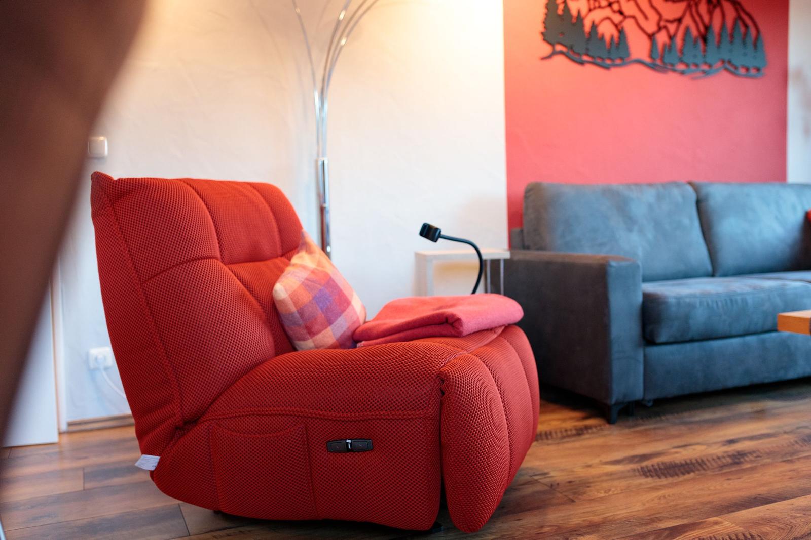 The generously open kitchen and living area is not only well equipped, but also opens up a breathtaking mountain panorama for you. Relax on high-quality leather furniture and enjoy the spacious balcony with outdoor furniture and views of the surrounding mountain range.