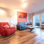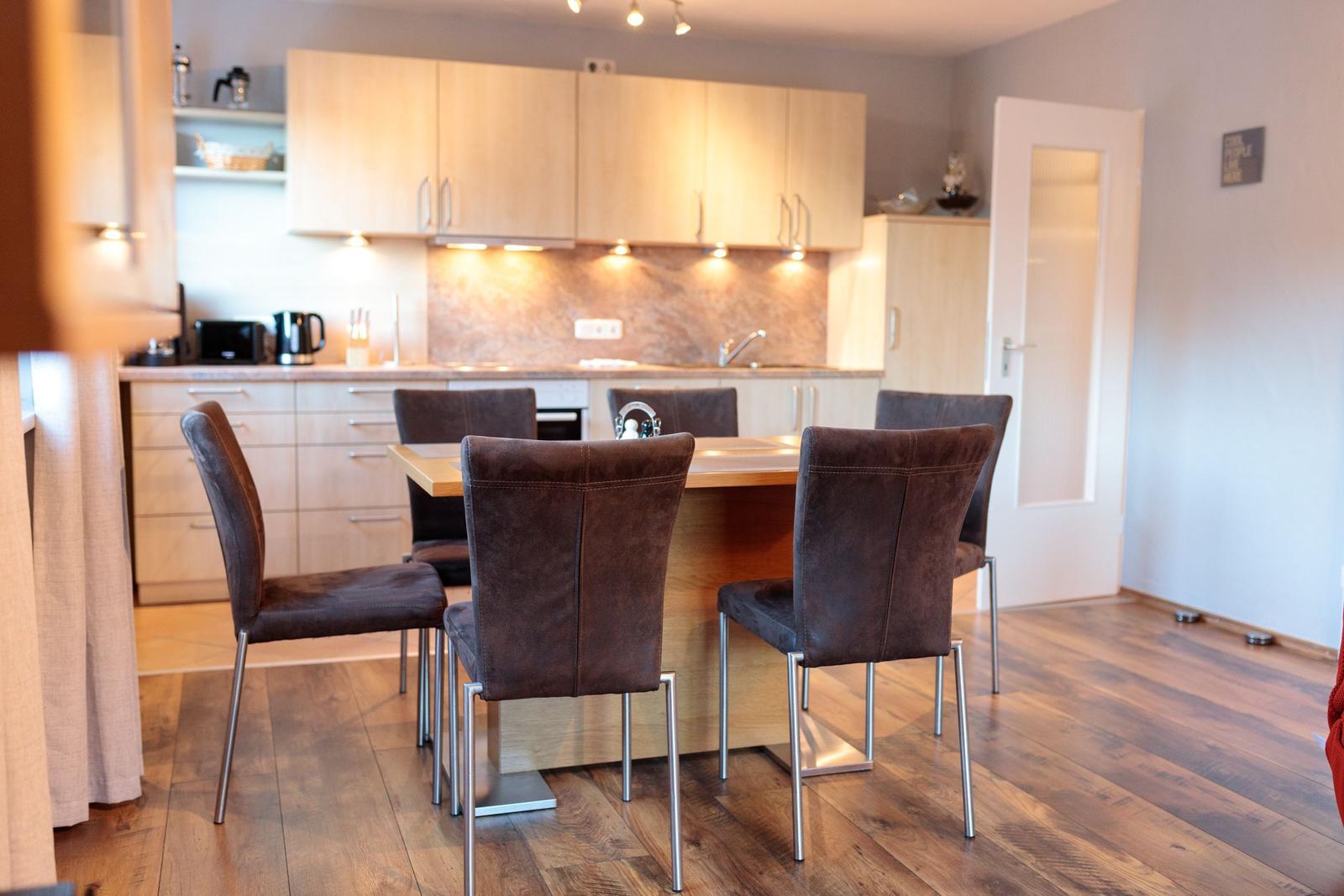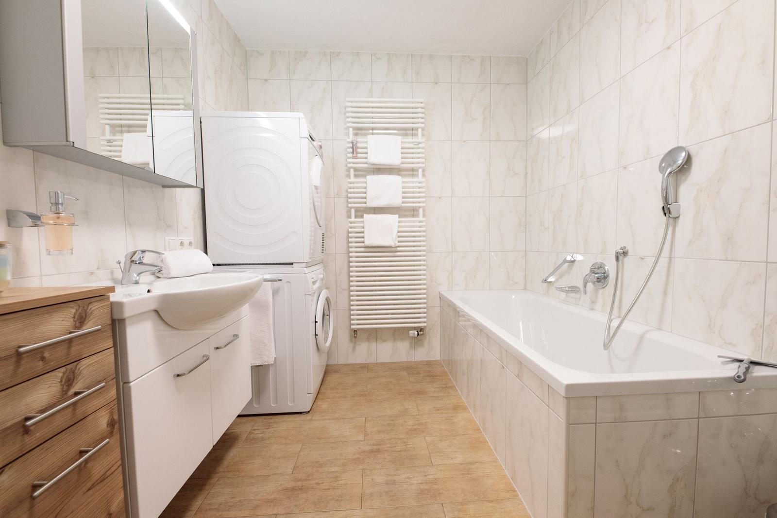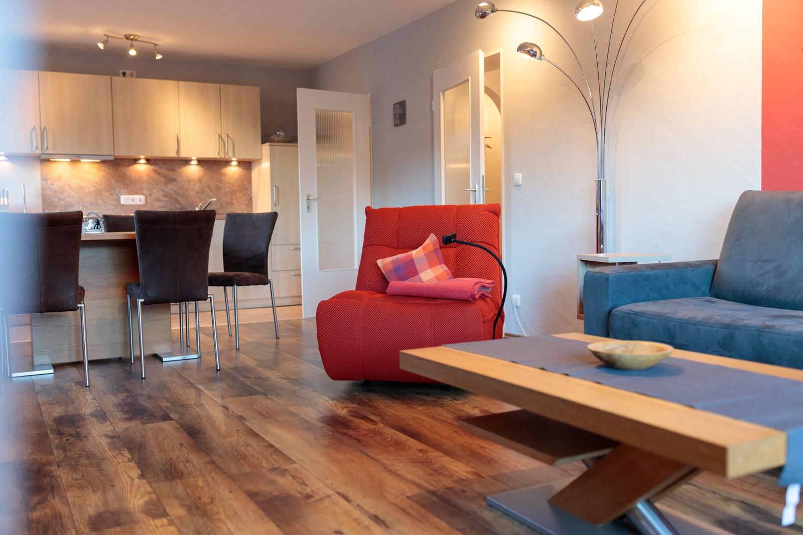 The bright and modern furnished 2-room holiday apartment has a spacious living room with a cozy leather sofa bed and leather comfort chair, as well as an open kitchen and a beautiful dining table. The kitchen is fully equipped with a stove with ceramic hob, oven, dishwasher and all the important utensils you will like to find. Bedroom with box spring bed, also individually adjustable as DBL or TWIN. High-quality blankets provide for dreamlike sleeping comfort. Bathroom with shower, bathtub and toilet, as well as underfloor heating. Washing machine and dryer are also available.