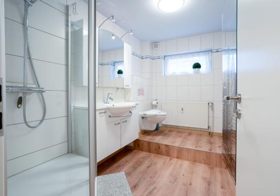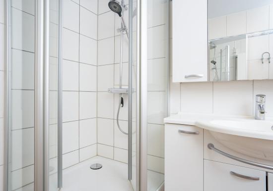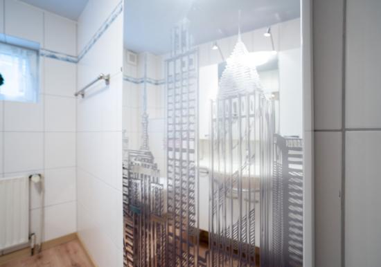 A hallway leads to a bright bathroom with a shower and, to the right, a comfortable bedroom furnished with a double bed and a spacious wardrobe.