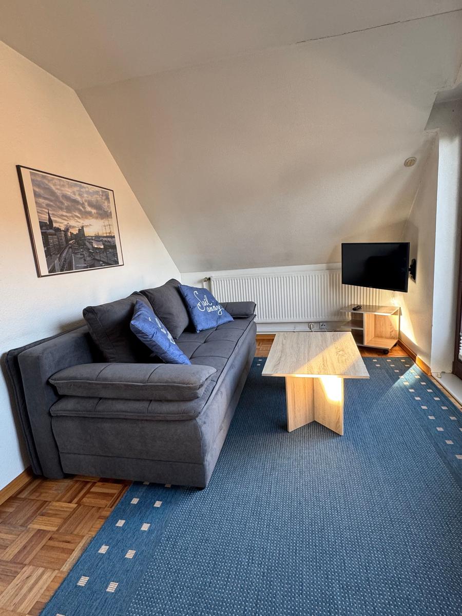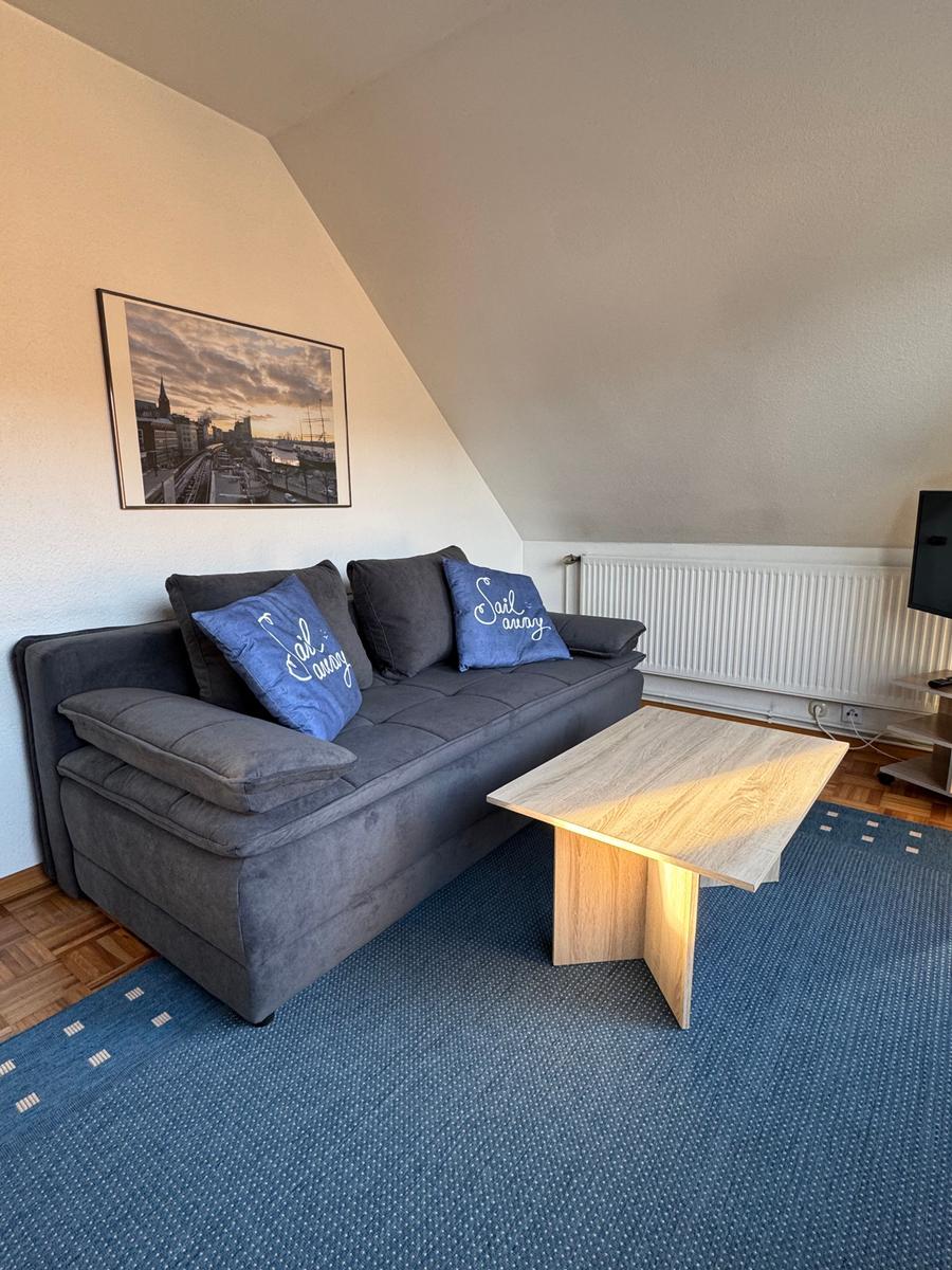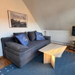 Double sofa bed (1,60 x2, 00), chair, coffee table, dining table with 4 chairs, wall