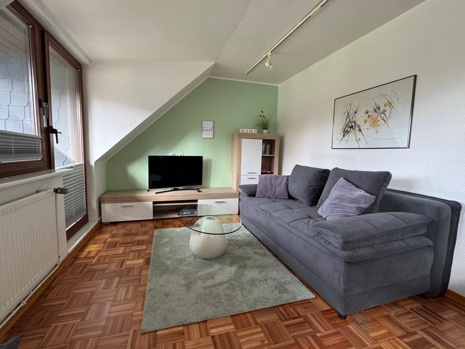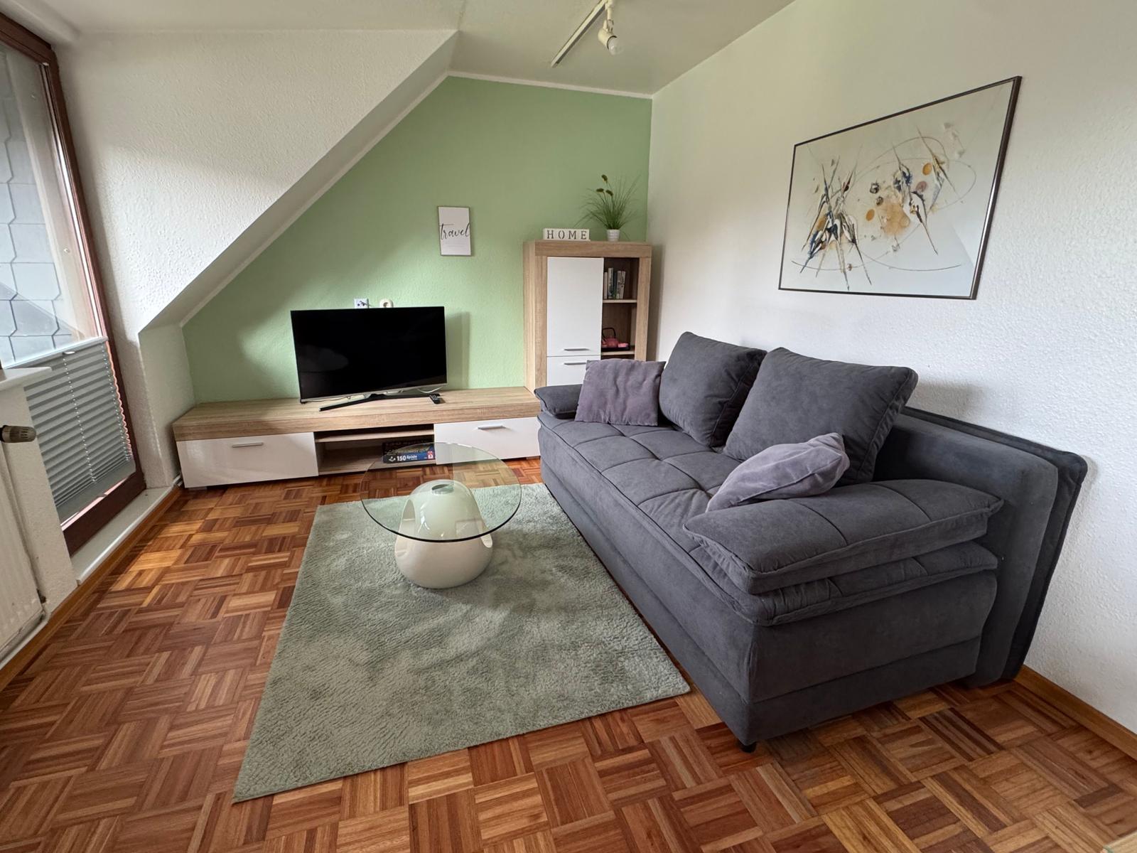 Double sofa bed (1,60 x2, 00), chair, coffee table, dining table with 4 chairs, wall