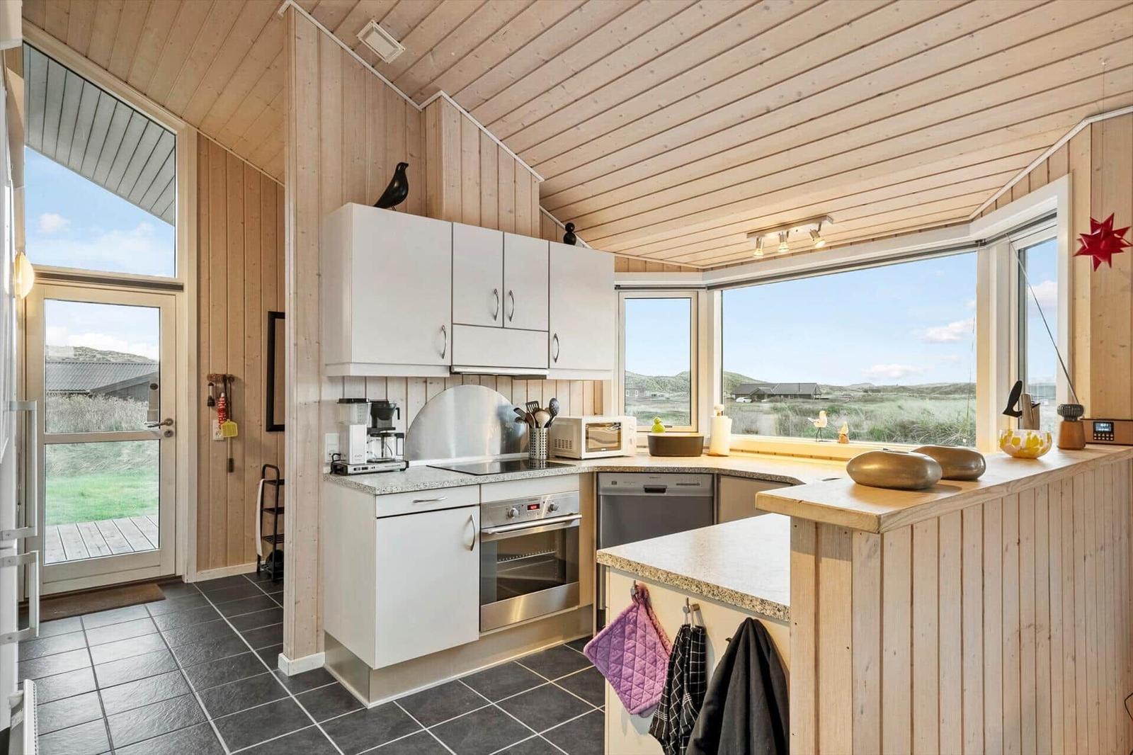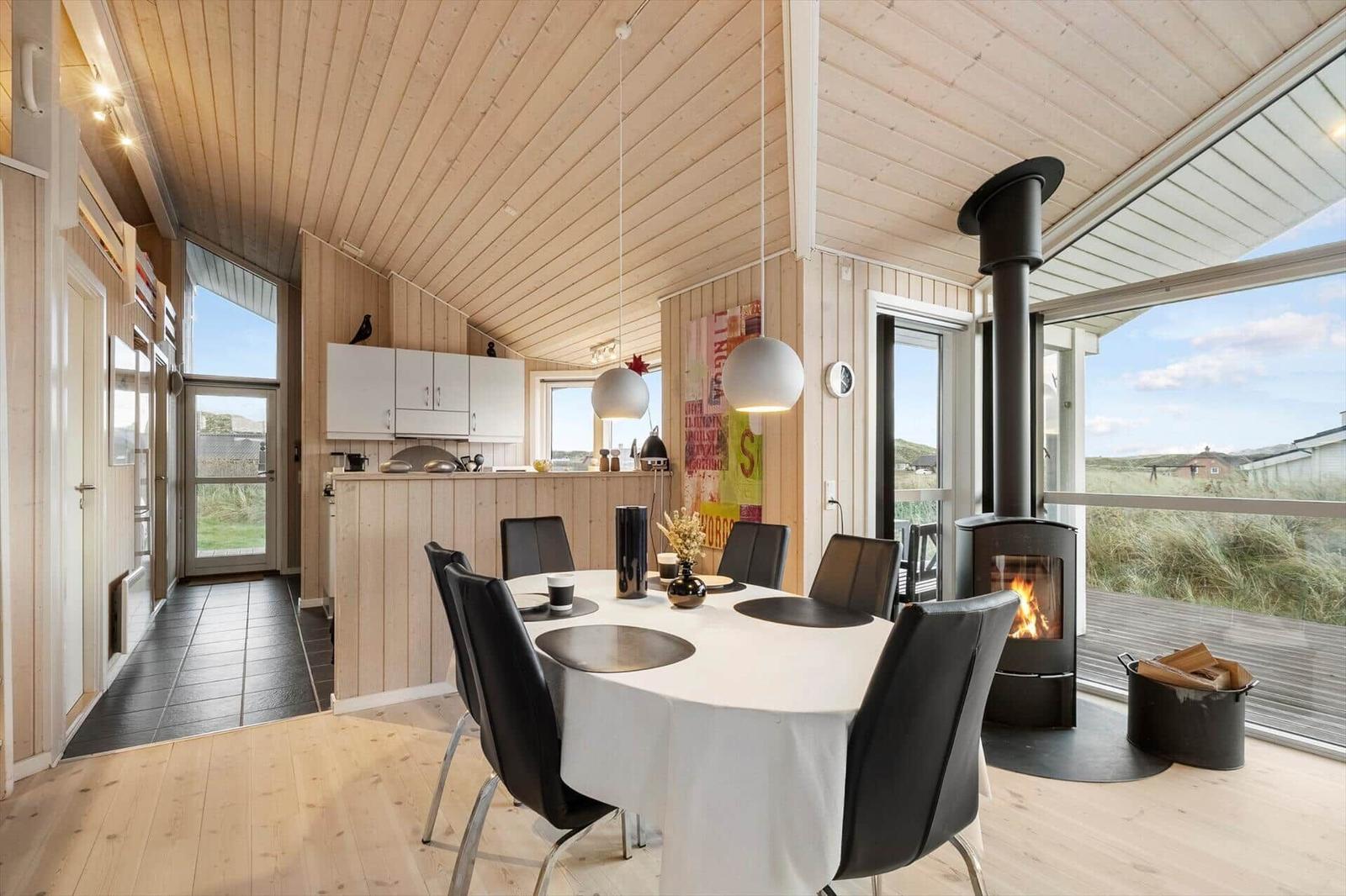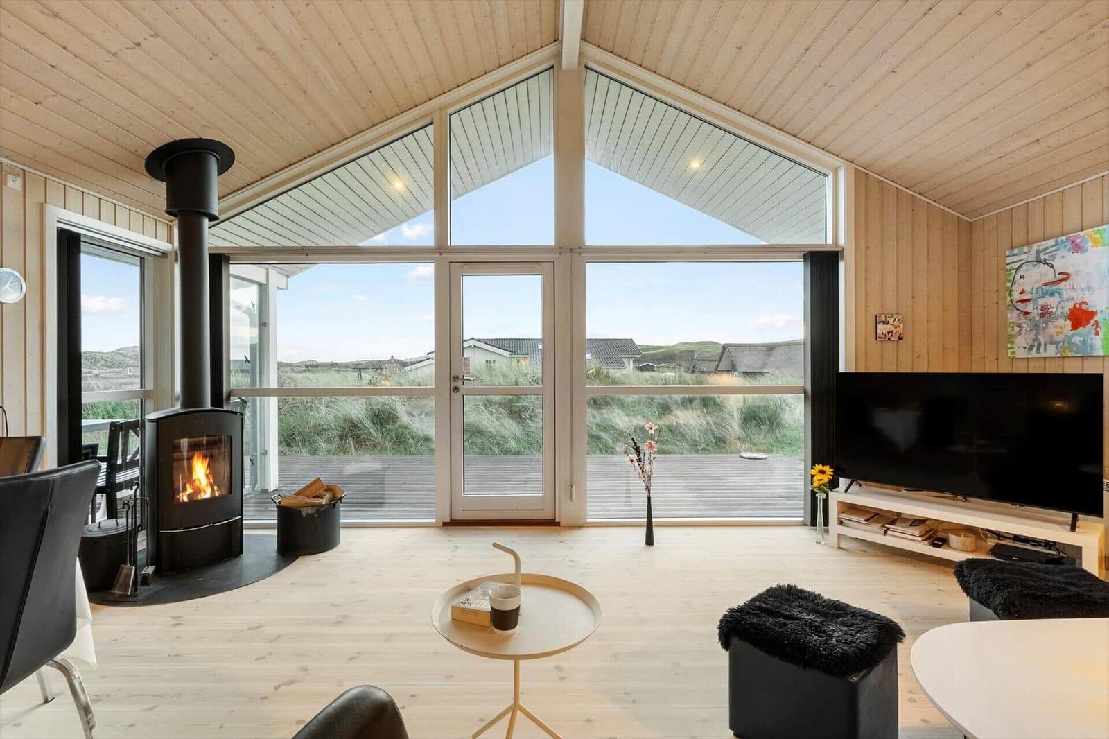 This well-maintained luxury wooden house accommodates up to 6 guests and features a loft perfect for children. The bright and spacious interior, enhanced by high ceilings and warm wooden floors, offers a cozy atmosphere. The open-plan kitchen is fully equipped with modern amenities, including a dishwasher, electric/gas stove, oven, microwave, refrigerator, coffee maker, and kettle, ensuring a comfortable cooking experience. The living area boasts a smart TV, DVD/Blu-ray player, and a wood stove, creating a perfect space for relaxation. The bathroom includes a shower and washing machine. The property features three bedrooms—two with double beds and one with two single beds. A large terrace wraps around the house, providing stunning views of the dunes and direct access to outdoor furniture and a grill. Complimentary high-speed Wi-Fi adds convenience for all guests, ensuring a wonderful vacation experience near the North Sea.