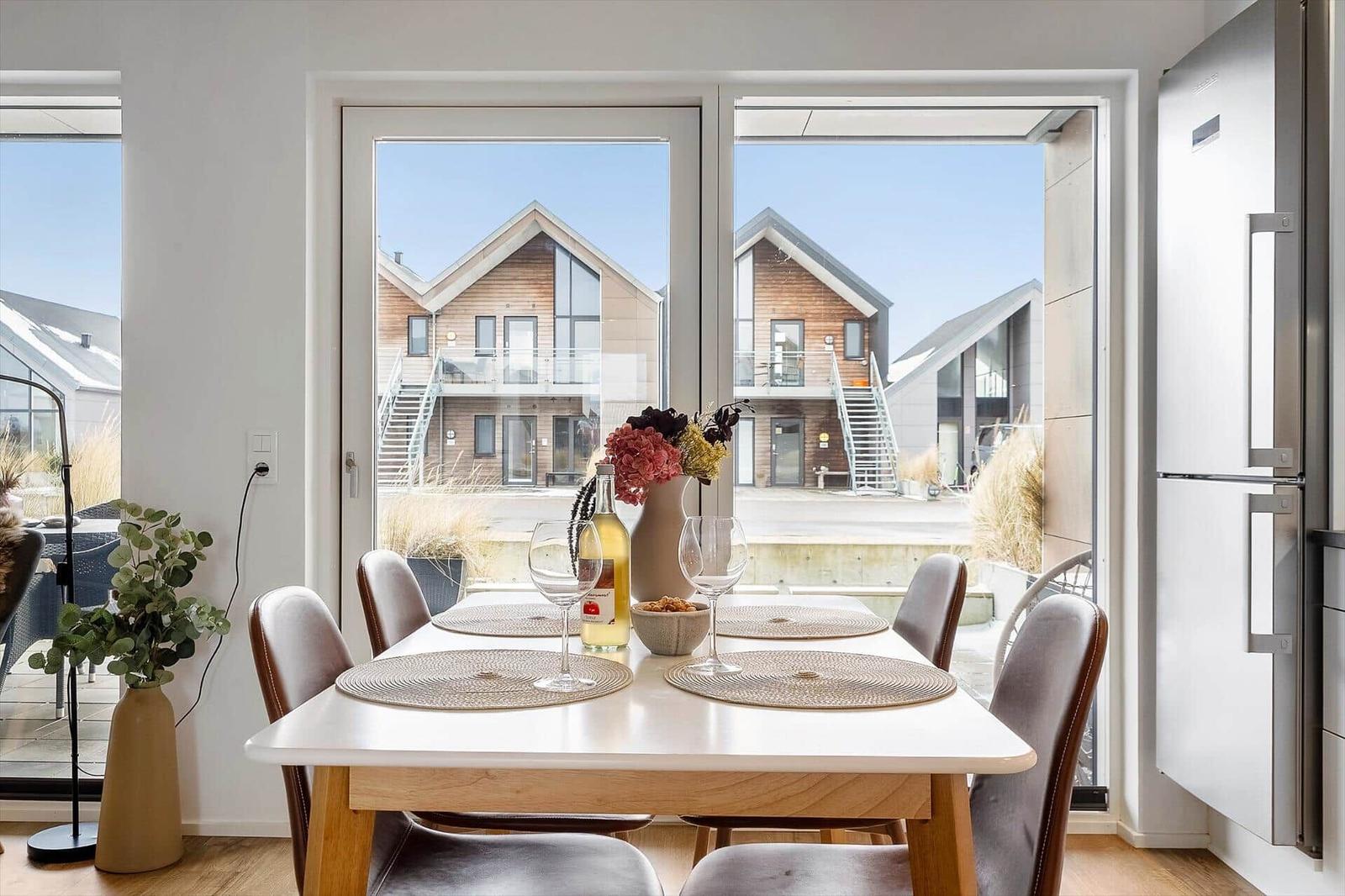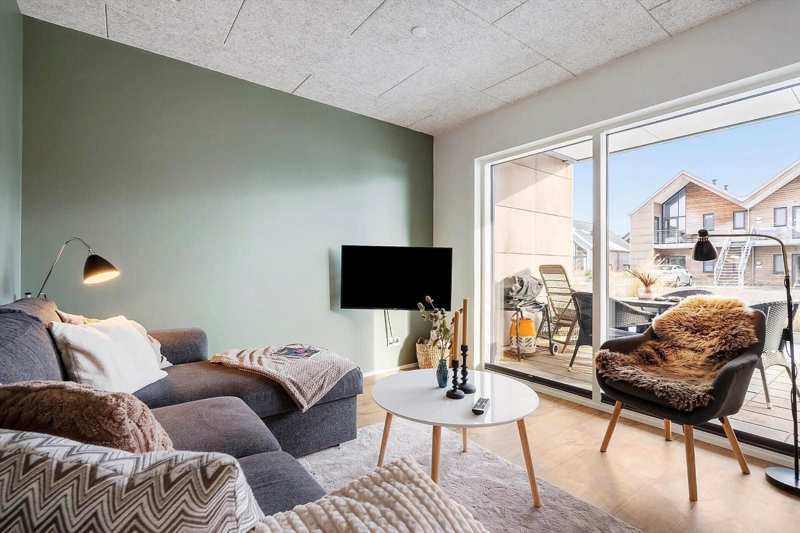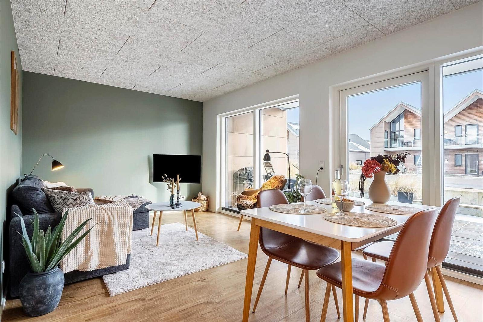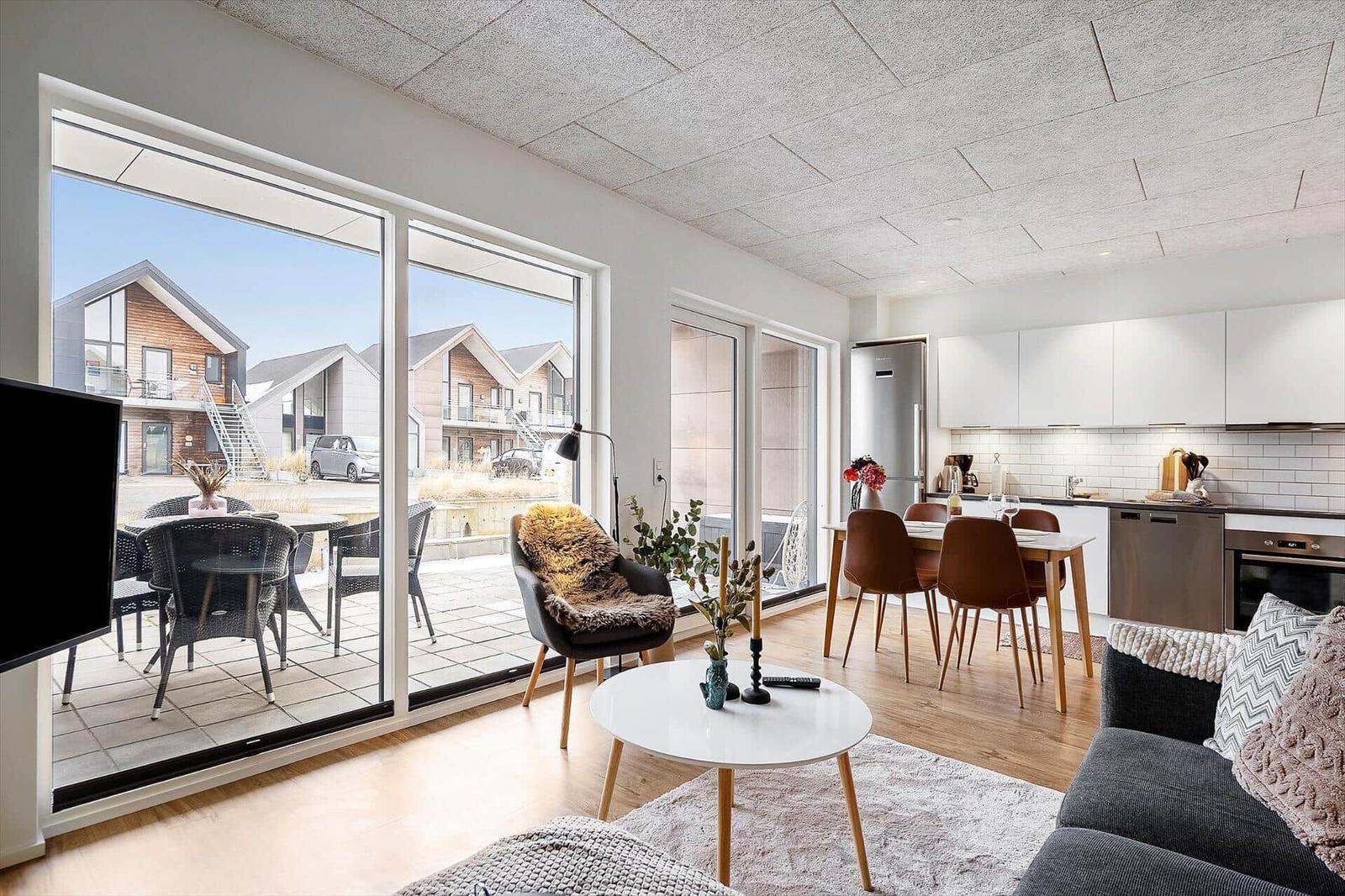 This charming holiday apartment, designed for two adults and two children, offers an ideal retreat for those seeking a vibrant atmosphere in Hvide Sande while enjoying a peaceful setting close to the water. Located in a modern, architect-designed complex built in 2021, the apartment spans 55 m² and features a bright, welcoming atmosphere. The open kitchen is equipped with modern appliances, including a dishwasher, oven, refrigerator, and coffee maker, promoting quality time together in the living area. Entertainment options include a Smart TV and high-speed WiFi. The stylish bathroom boasts a shower, underfloor heating, and a washer-dryer combo. A comfortable bedroom and a cozy sofa bed in the living room provide ample sleeping arrangements. Guests can unwind on the spacious partially covered south-facing terrace, relishing the soothing sounds of the nearby waves. Ideal for families, the apartment combines comfort with convenient access to local attractions and scenic views.