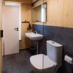 The compact bathroom is fitted with a modern walk-in shower, toilet, sink, mirror with infrared heating, and a hairdryer. Wi-Fi is available at no extra cost, making this accommodation perfect for families, couples, and nature lovers.