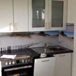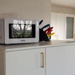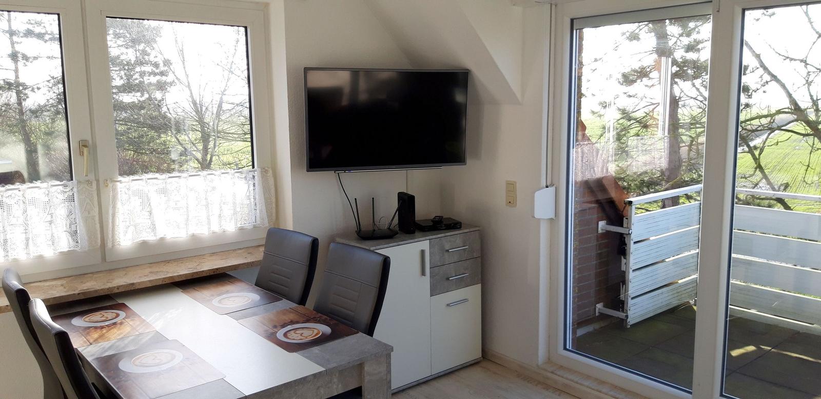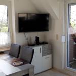 This modern holiday apartment is located on the first floor of a multi-family home, accommodating up to four guests. The living and dining area features a comfortable sofa and a cable/smart TV. An open-concept design connects the living space with the kitchen, which is equipped with a ceramic stove, dishwasher, oven, and refrigerator with a freezer compartment. Essential kitchenware, a coffee maker, and a toaster are also provided.