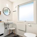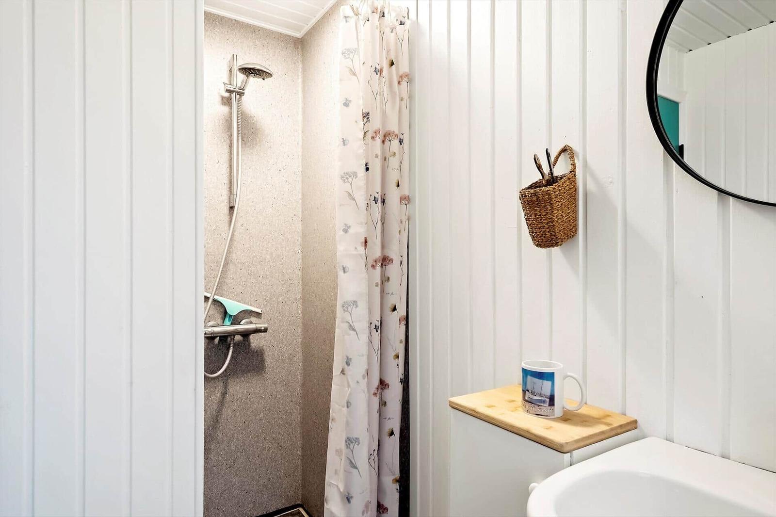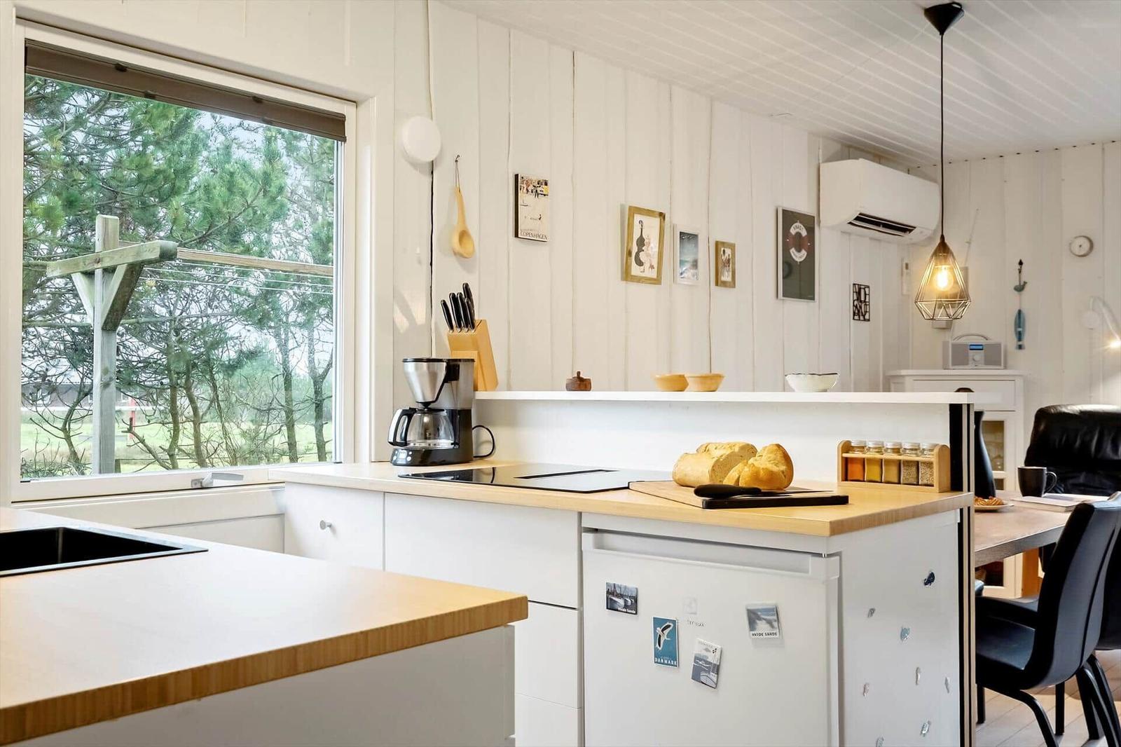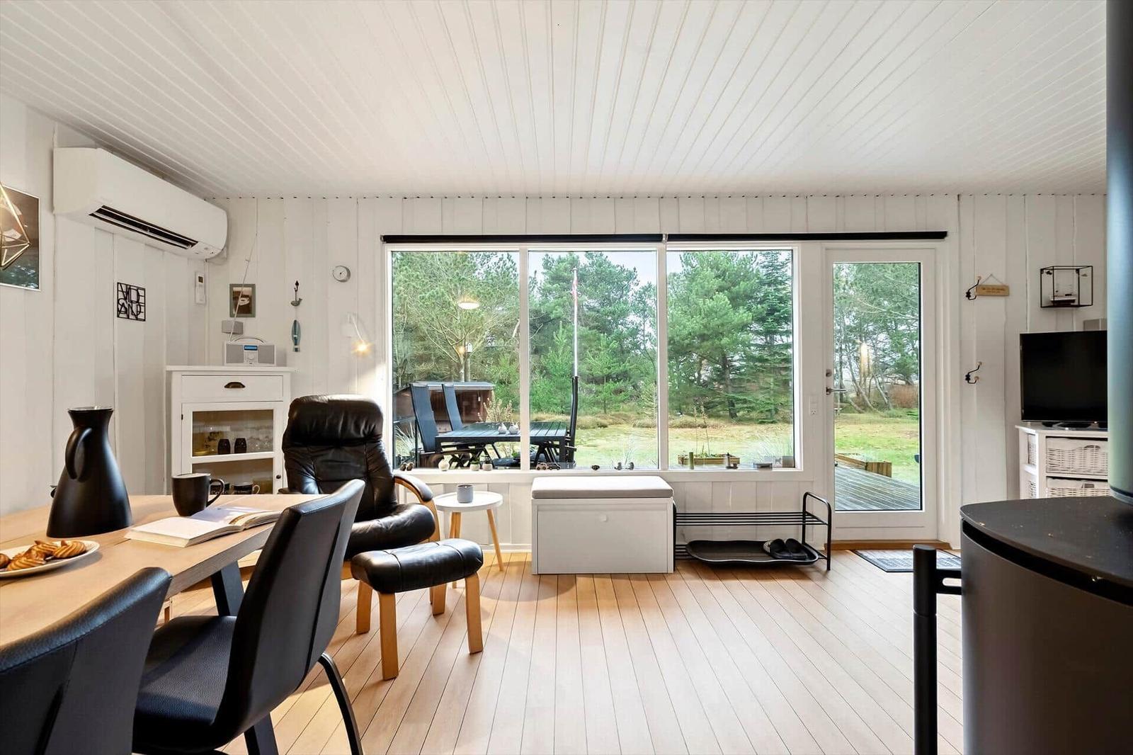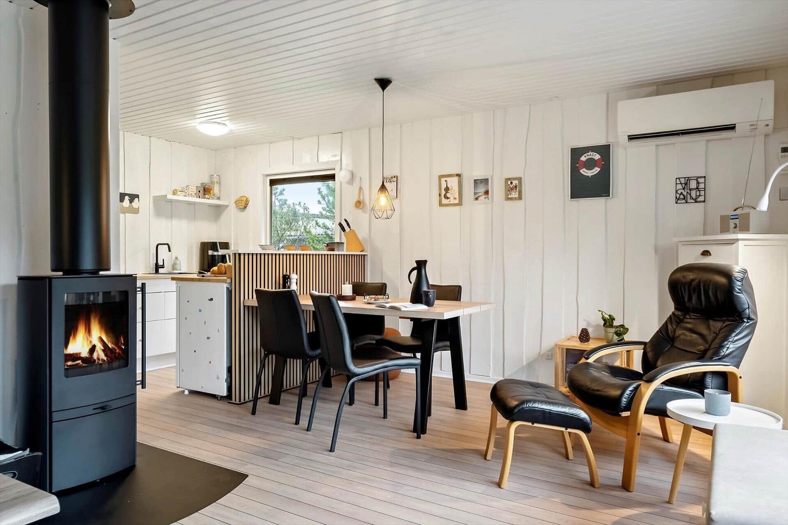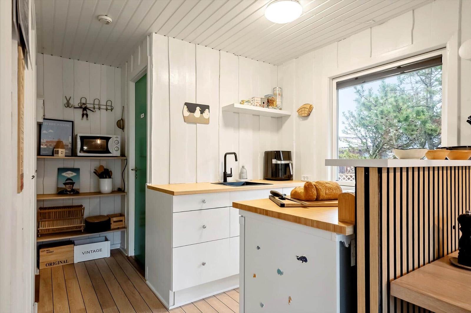 The open kitchen is fully equipped with a refrigerator, a convenient coffee maker, an efficient air fryer, and a pizza oven. A separate freezer is available in the shed. The living area, adorned with large south-facing windows, lets in ample light and includes a comfortable seating arrangement and a TV with access to five Danish channels. The stylish bathroom features a shower, and energy-efficient heating ensures comfort year-round. Guests can relax on the sunlit terrace or explore the lush garden, making this apartment a perfect base for outdoor adventures.