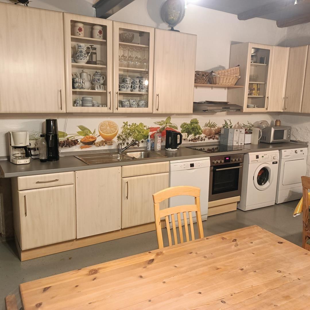 The Biberburg offers a cozy 35 m² vacation rental located on the ground floor. The bedroom features two single beds (90 cm) and a wardrobe, while the living area includes a sofa bed, a flat-screen TV, and a table with chairs. The kitchenette is equipped with a refrigerator (including a freezer compartment), a mobile 2-burner ceramic cooktop, a kettle, a coffee machine, a microwave, as well as ample dishes, pots, and pans. Guests can enjoy complimentary Wi-Fi, along with provided towels and bed linen. Additionally, a communal room is available, featuring a large stove with an oven, washing machine, dryer, dishes, and comfortable seating. Guests can also utilize the shared beer garden and garden area with various seating arrangements. Breakfast and dinner are available upon request.