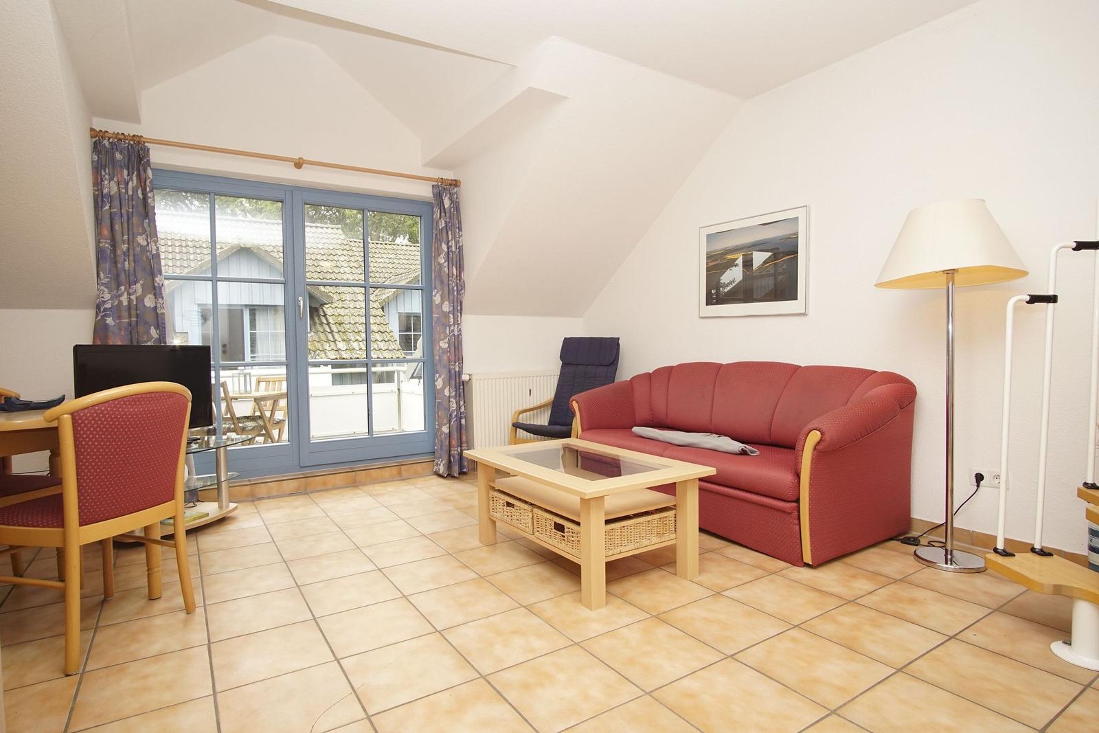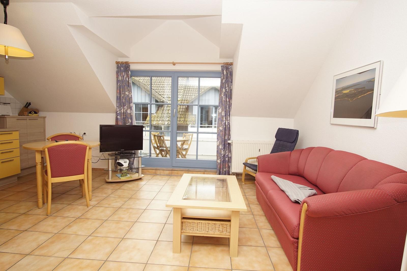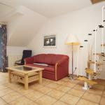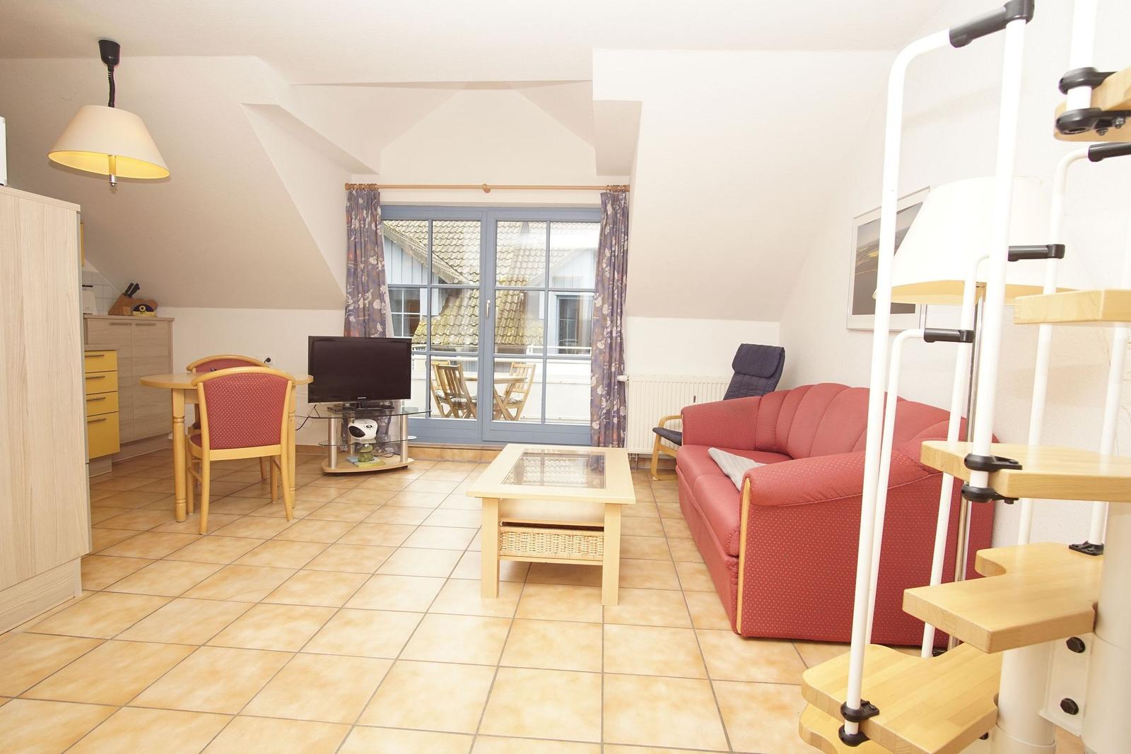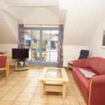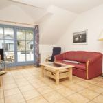 The Ferienresidenz Kap Arkona offers a comfortable and well-appointed two-room vacation apartment suitable for up to 4 guests (+1 infant). Spanning 40 m², the space includes a cozy living room featuring a dining area and a seating arrangement with cable TV, creating an inviting atmosphere for relaxation. The modern kitchenette is equipped with a two-burner ceramic stove, dishwasher, refrigerator with freezer compartment, microwave, toaster, kettle, and coffee machine, along with ample cutlery, dishes, and kitchen utensils.