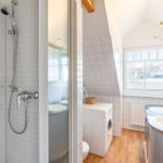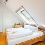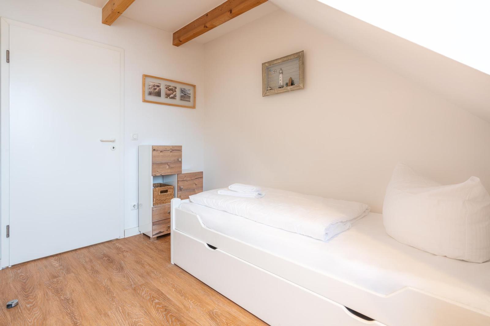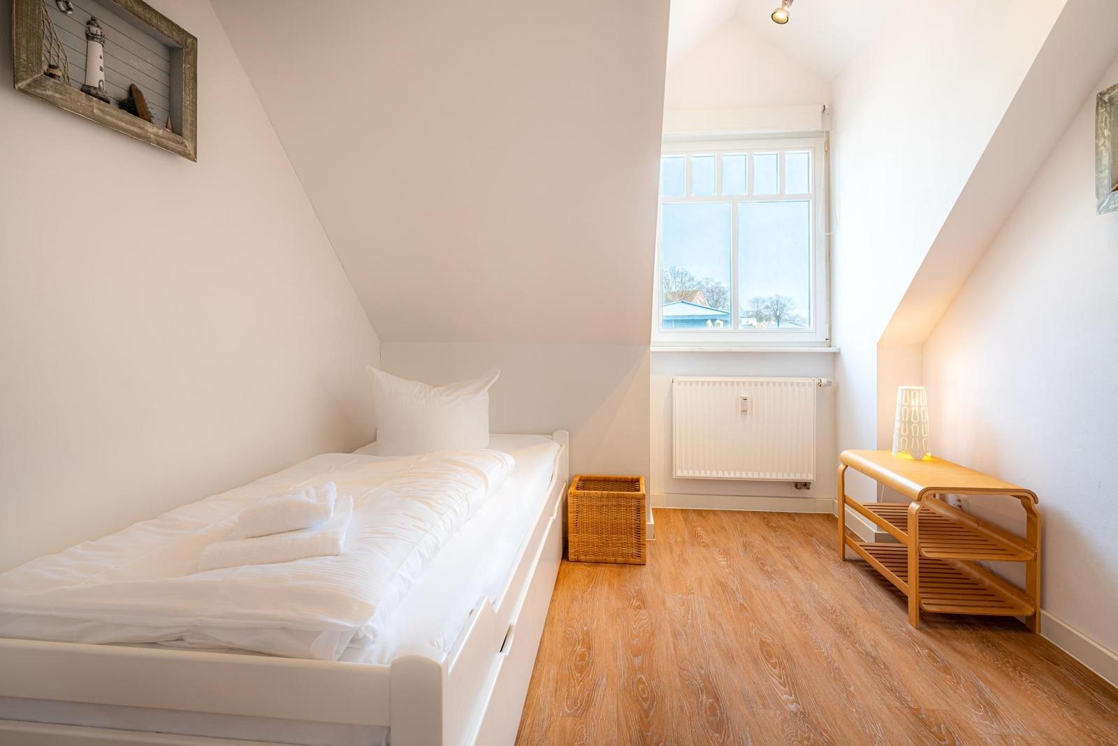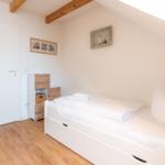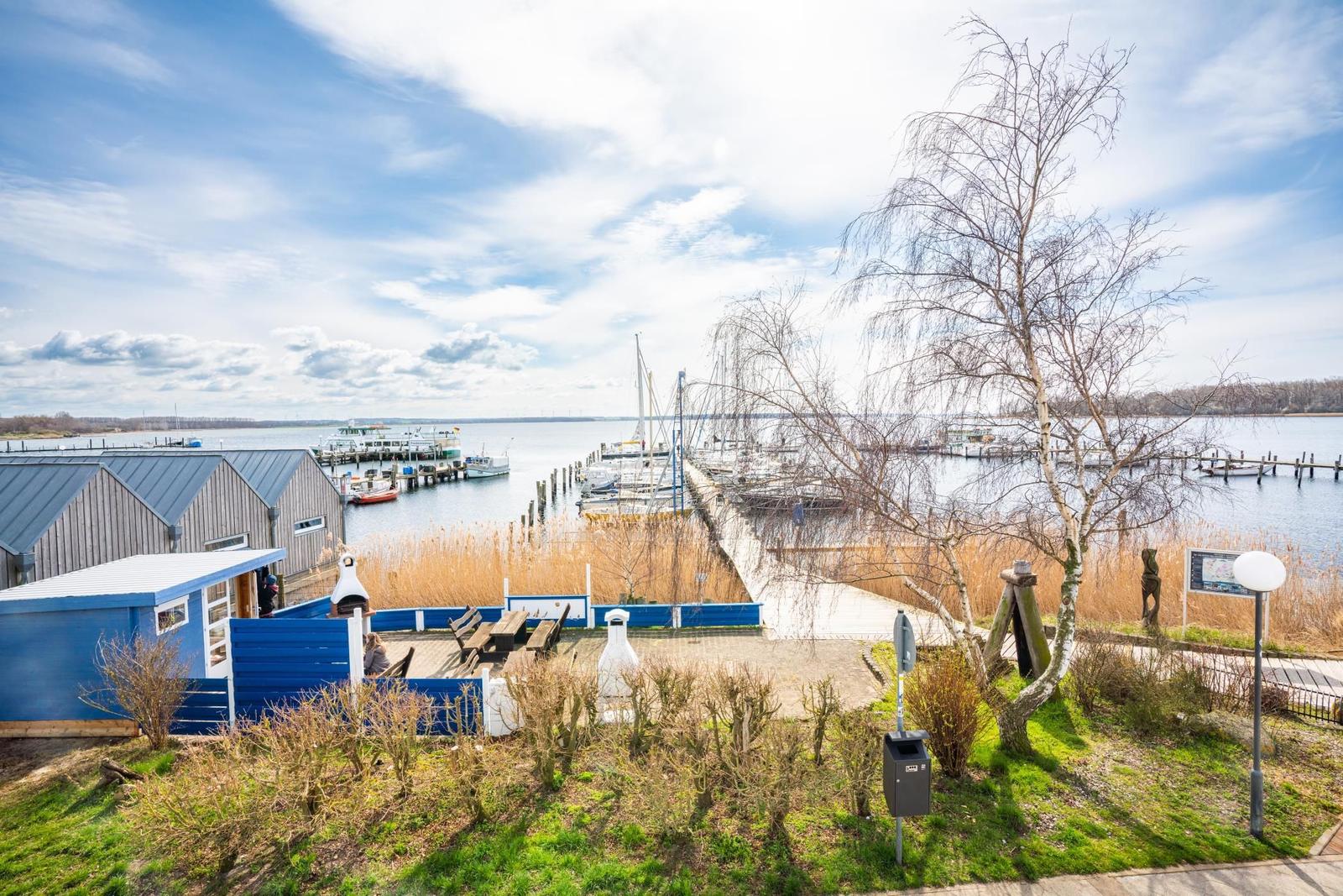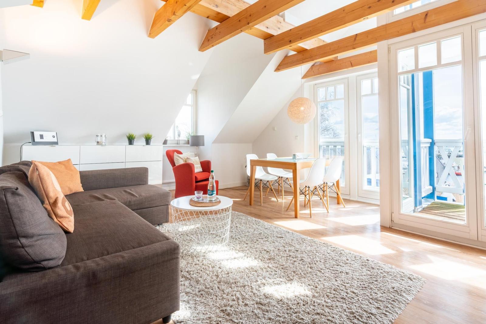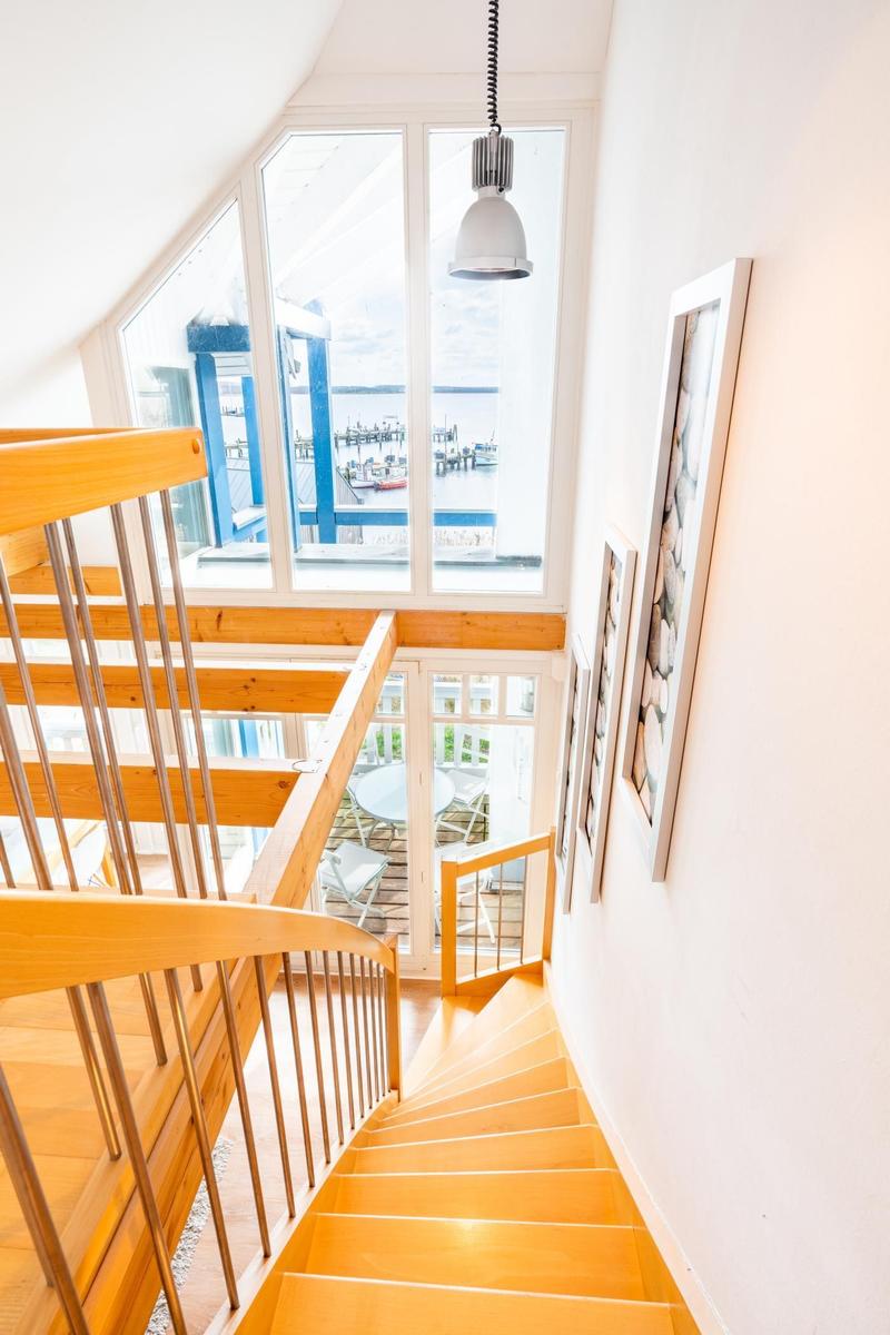 In a unique location directly by the Salzhaff, the 'Haus am Yachthafen' offers a two-level vacation apartment decorated in a Scandinavian style, accommodating up to four guests. The charming wooden beam ceiling creates a warm atmosphere, while large windows provide ample natural light and stunning views of the water and the small fishing harbor.