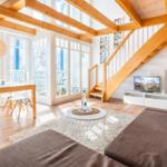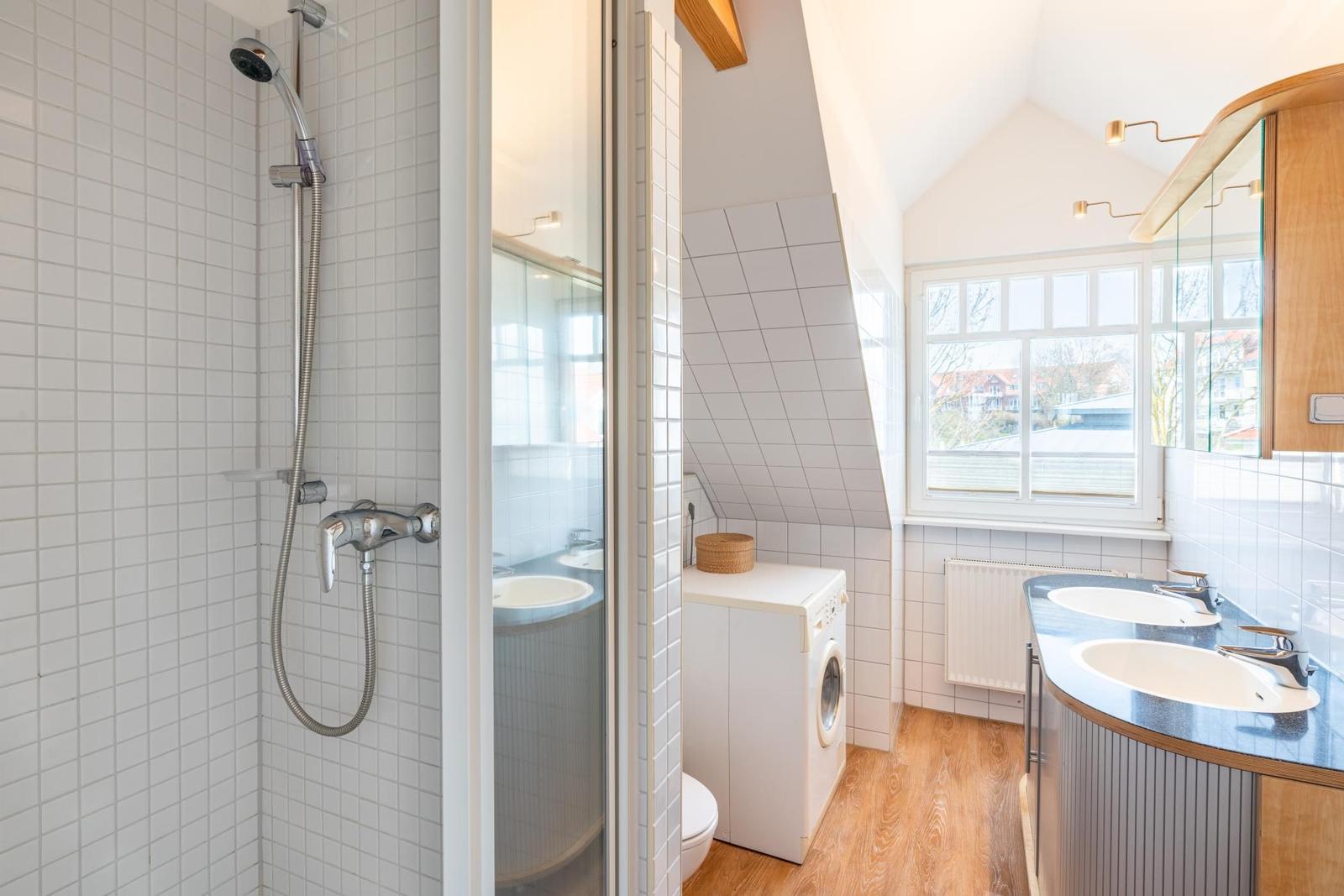 The well-equipped open kitchen features a ceramic cooktop, oven, and dishwasher for convenient meal preparation. The living area boasts a spacious seating arrangement, a flat-screen TV, and a CD player. The smaller bedroom on the lower level includes a single bed that can be extended with an additional mattress. An open gallery leads to a comfortable double bed and a generous walk-in closet for ample storage. The daylight bathroom is fitted with a shower, two sinks, and a washer-dryer unit, along with a hairdryer for added convenience.