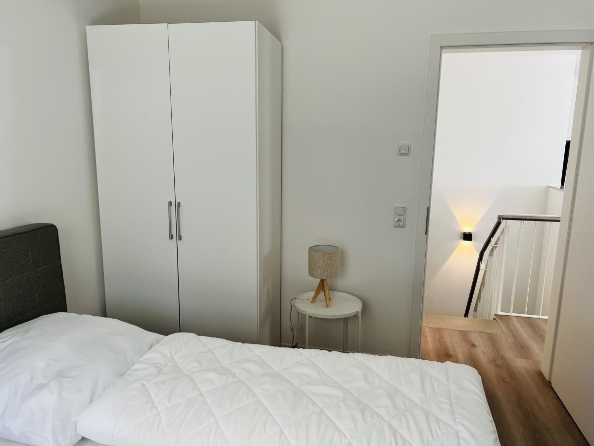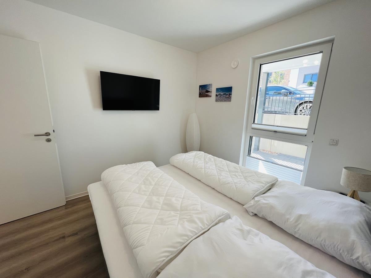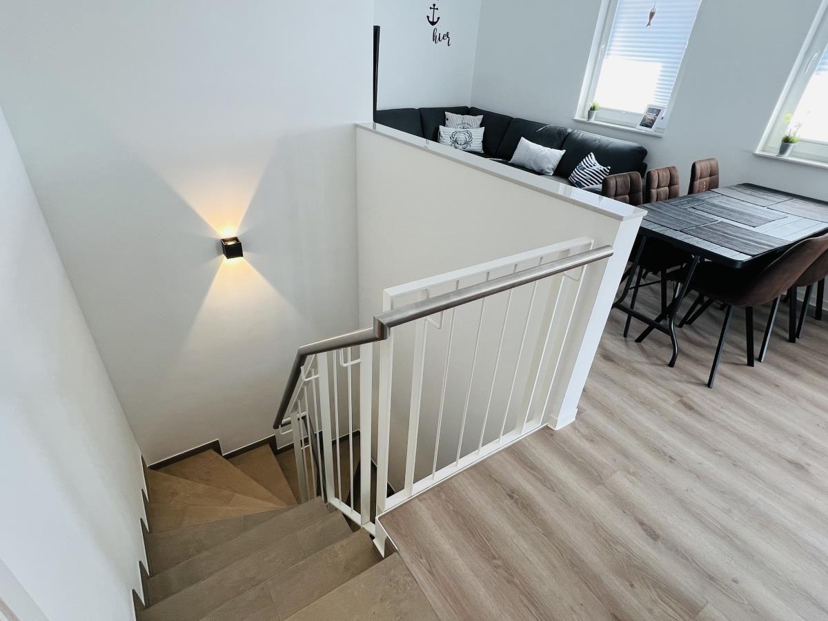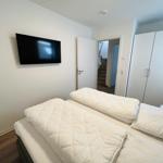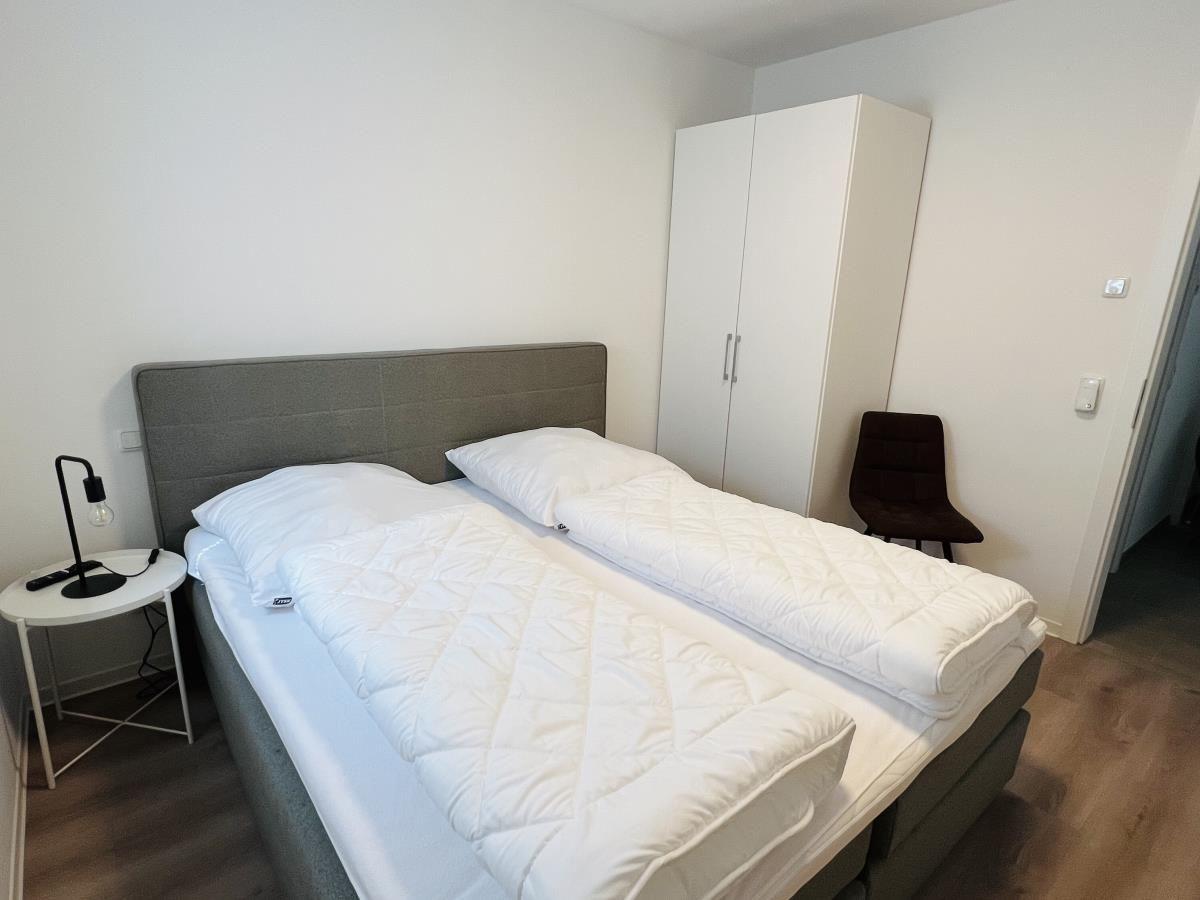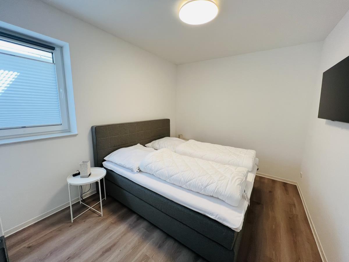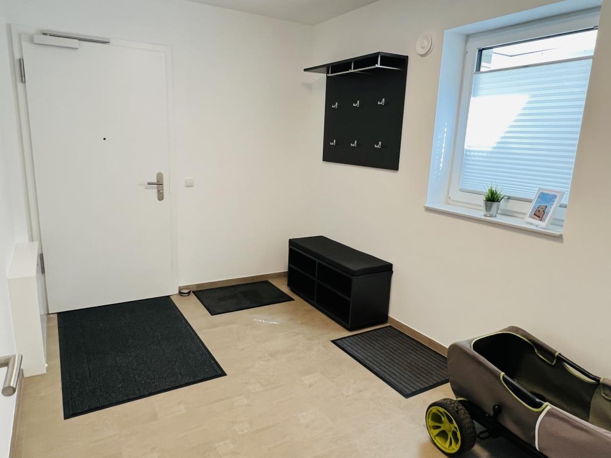 The exclusive and newly built 4-room maisonette apartment offers accommodation for up to 6 guests with a living space of approximately 90m². The apartment, which was first used in September 2022, is accessible via a separate entrance located directly at the parking area. The ground floor features a living room with an open kitchen and dining area that seats up to 6 people, as well as a bedroom with a double bed (180x200 cm) and a stylish bathroom complete with a shower, WC, washbasin, hairdryer, and towel heater. The kitchen is fully equipped with a dishwasher, ceramic cooktop, oven, refrigerator with freezer, coffee machine, toaster, and kettle. The lower level includes two additional bedrooms, both with double beds (180x200 cm) and a shared bathroom. Free Wi-Fi and a washing machine with drying function are also provided. The property is non-smoking and does not allow pets.
