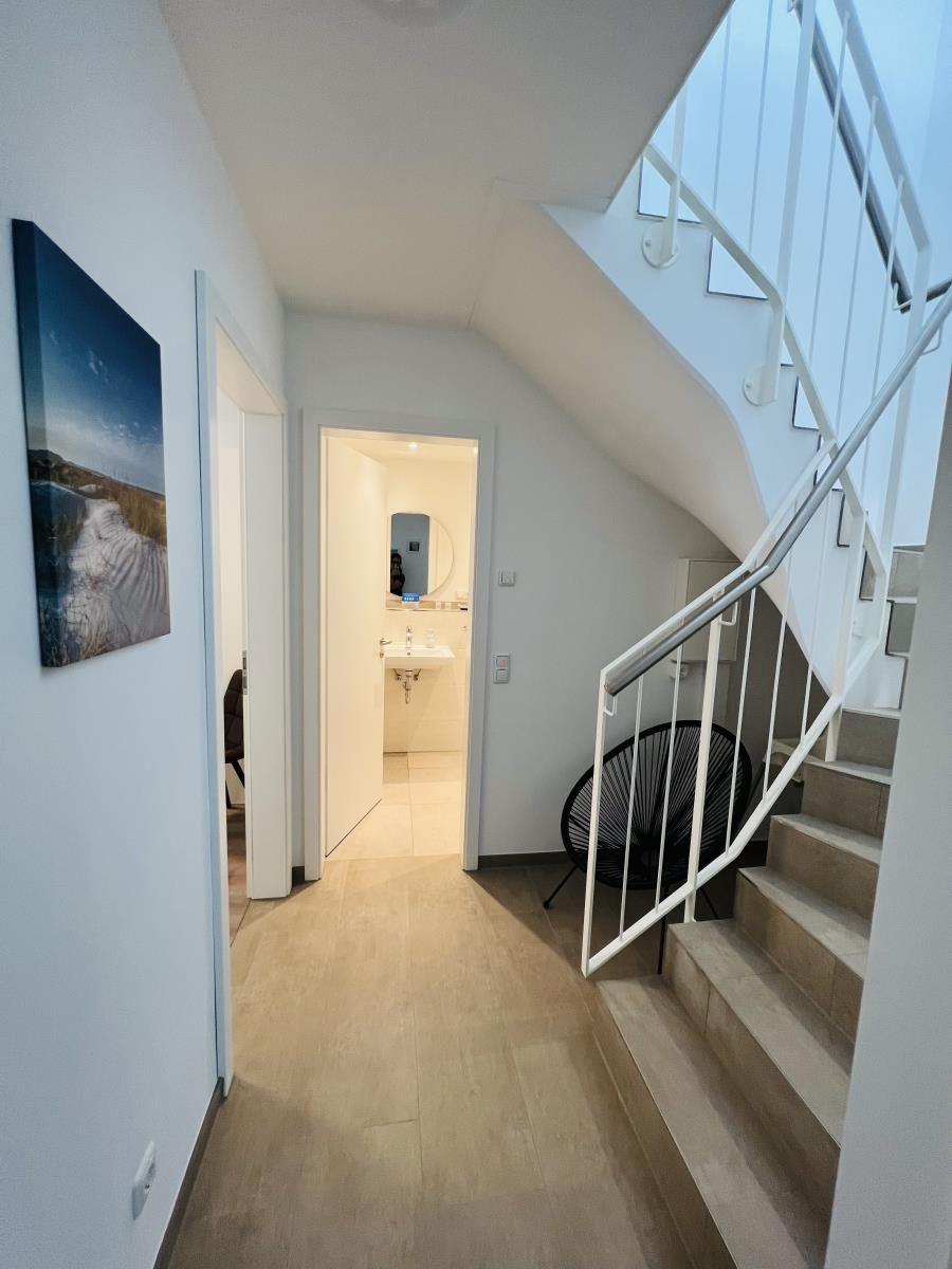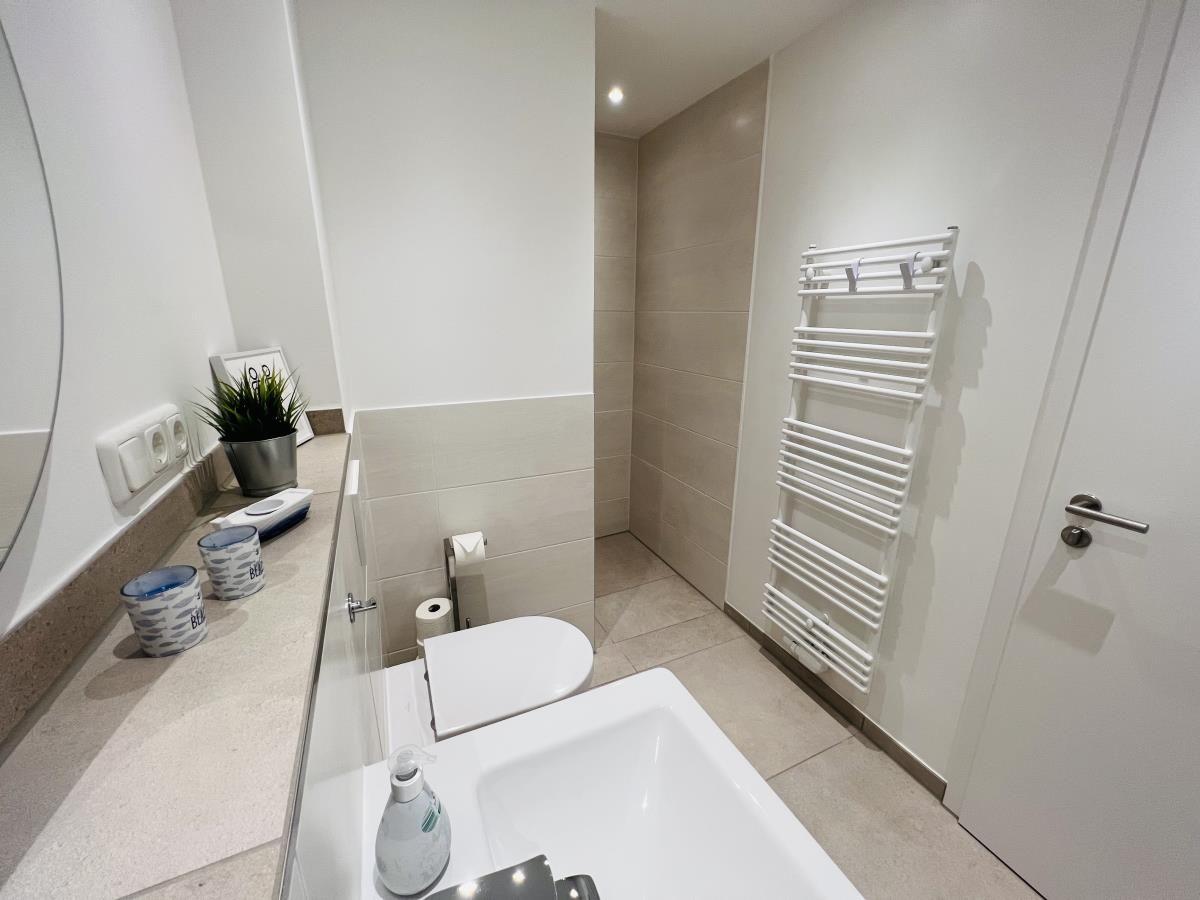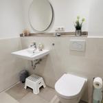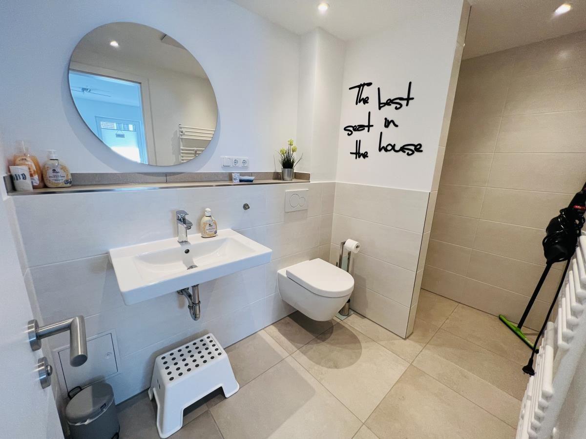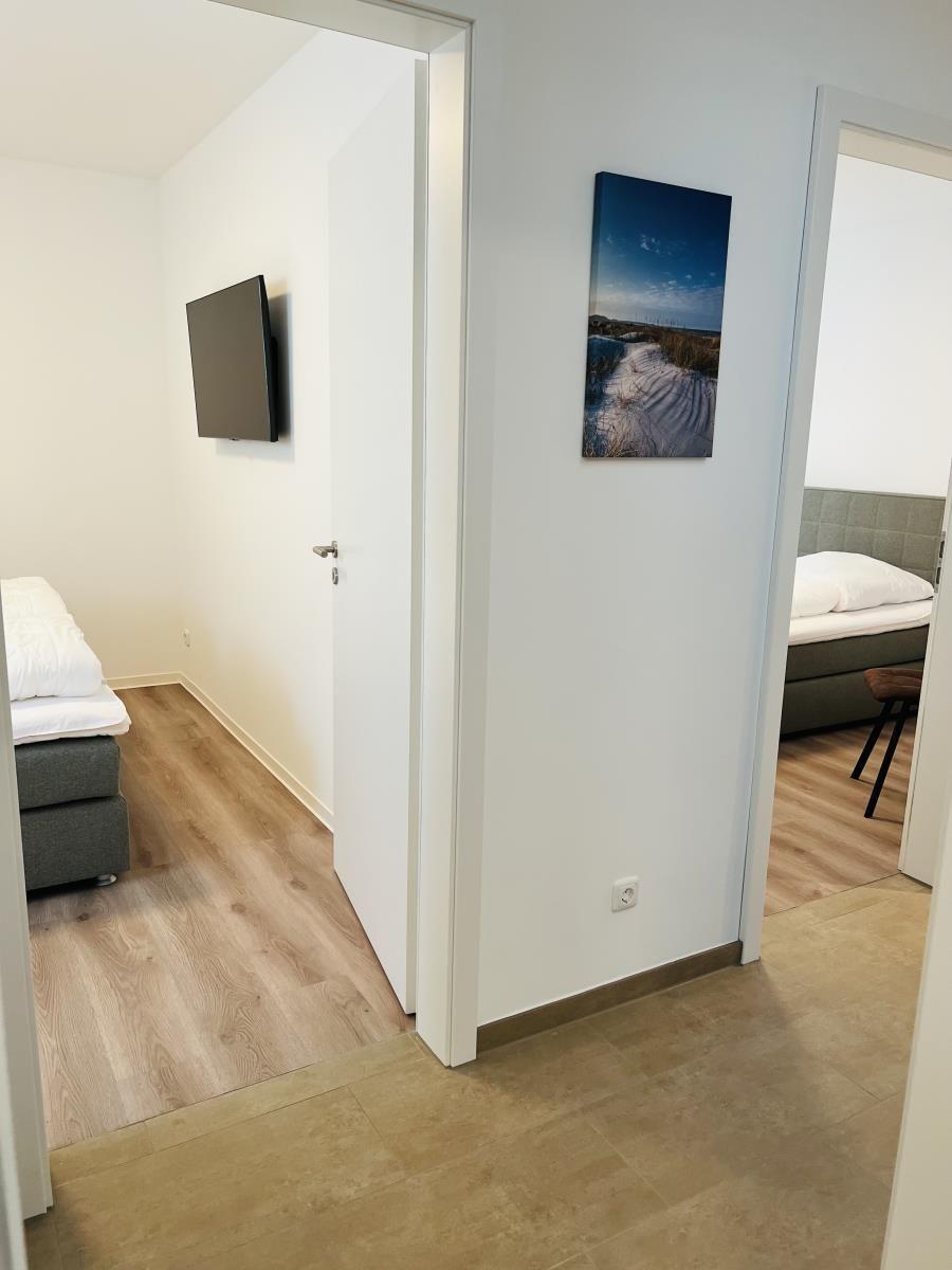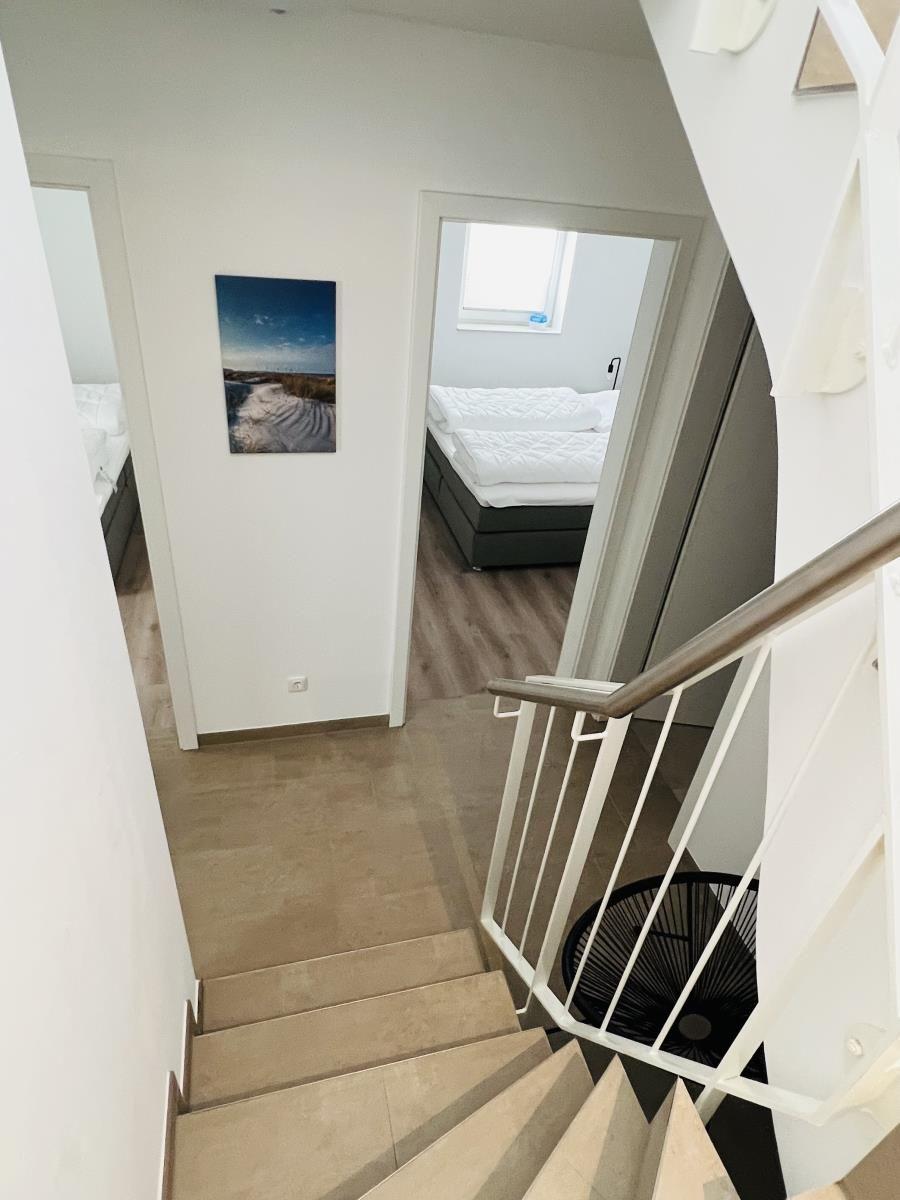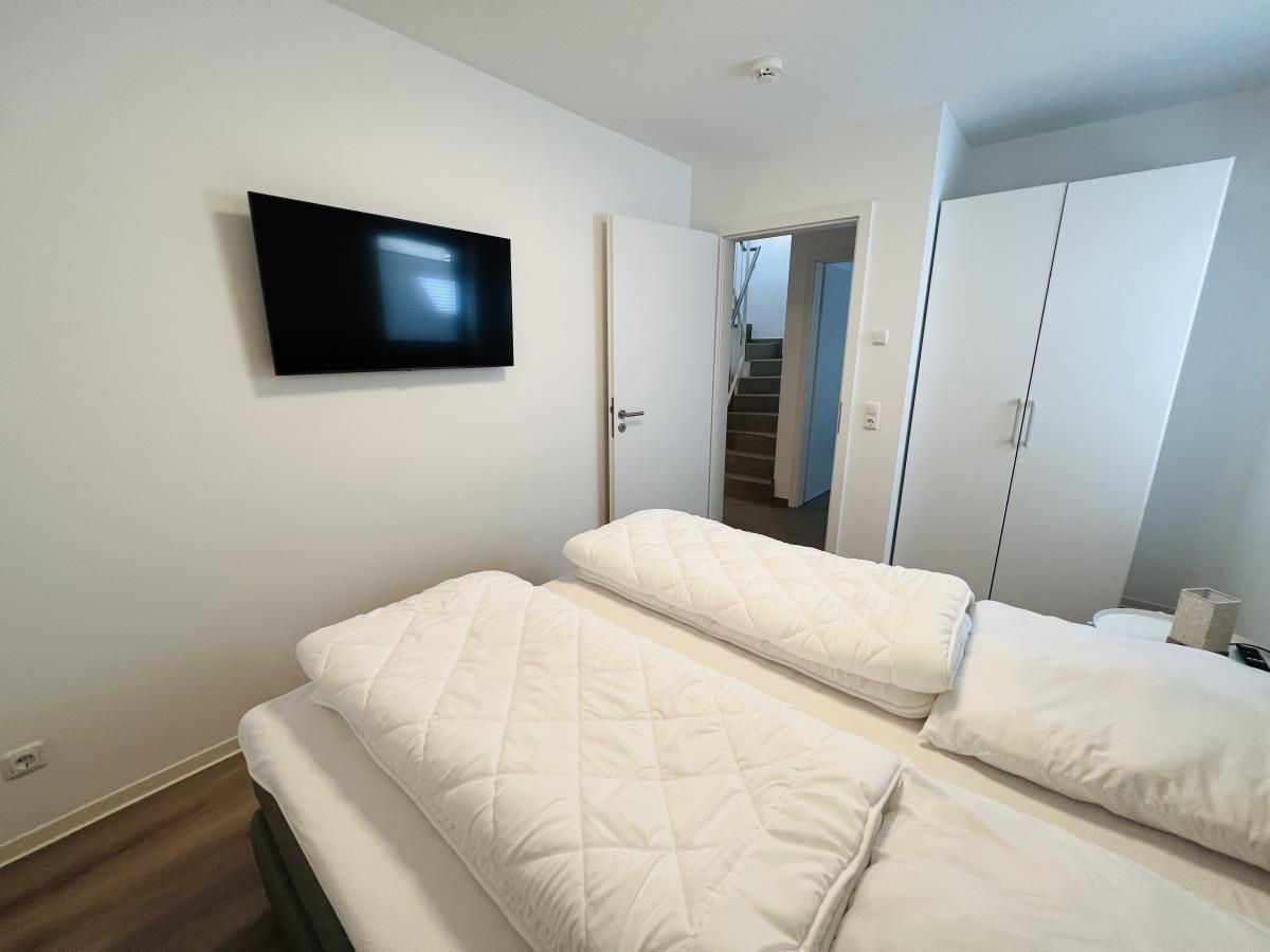The exclusive and newly built 4-room maisonette apartment offers accommodation for up to 6 guests with a living space of approximately 90m². The apartment, which was first used in September 2022, is accessible via a separate entrance located directly at the parking area. The ground floor features a living room with an open kitchen and dining area that seats up to 6 people, as well as a bedroom with a double bed (180x200 cm) and a stylish bathroom complete with a shower, WC, washbasin, hairdryer, and towel heater. The kitchen is fully equipped with a dishwasher, ceramic cooktop, oven, refrigerator with freezer, coffee machine, toaster, and kettle. The lower level includes two additional bedrooms, both with double beds (180x200 cm) and a shared bathroom. Free Wi-Fi and a washing machine with drying function are also provided. The property is non-smoking and does not allow pets.