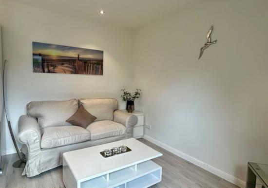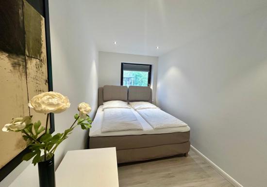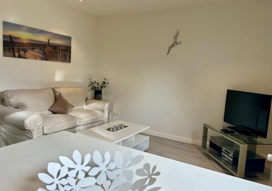 This charming vacation apartment features a modern and spacious layout, accommodating guests with three well-appointed bedrooms, including two double beds and a sofa bed in the comfortable living area. There are two bathrooms, one with a convenient walk-in shower and the other offering a relaxing bathtub.