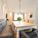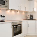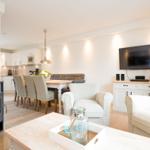 The Seestern - House Hamburg is a luxurious holiday home designed for up to 8 guests, featuring elegant landhouse-style flooring and modern amenities. Each of the four bedrooms is outfitted with flat-screen TVs, ensuring entertainment throughout the stay. The ground floor boasts a beautifully furnished living and dining area, highlighted by a cozy fireplace that creates a warm ambiance. The fully equipped kitchen is stylishly presented in white, perfect for preparing meals.