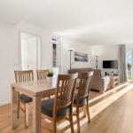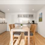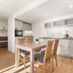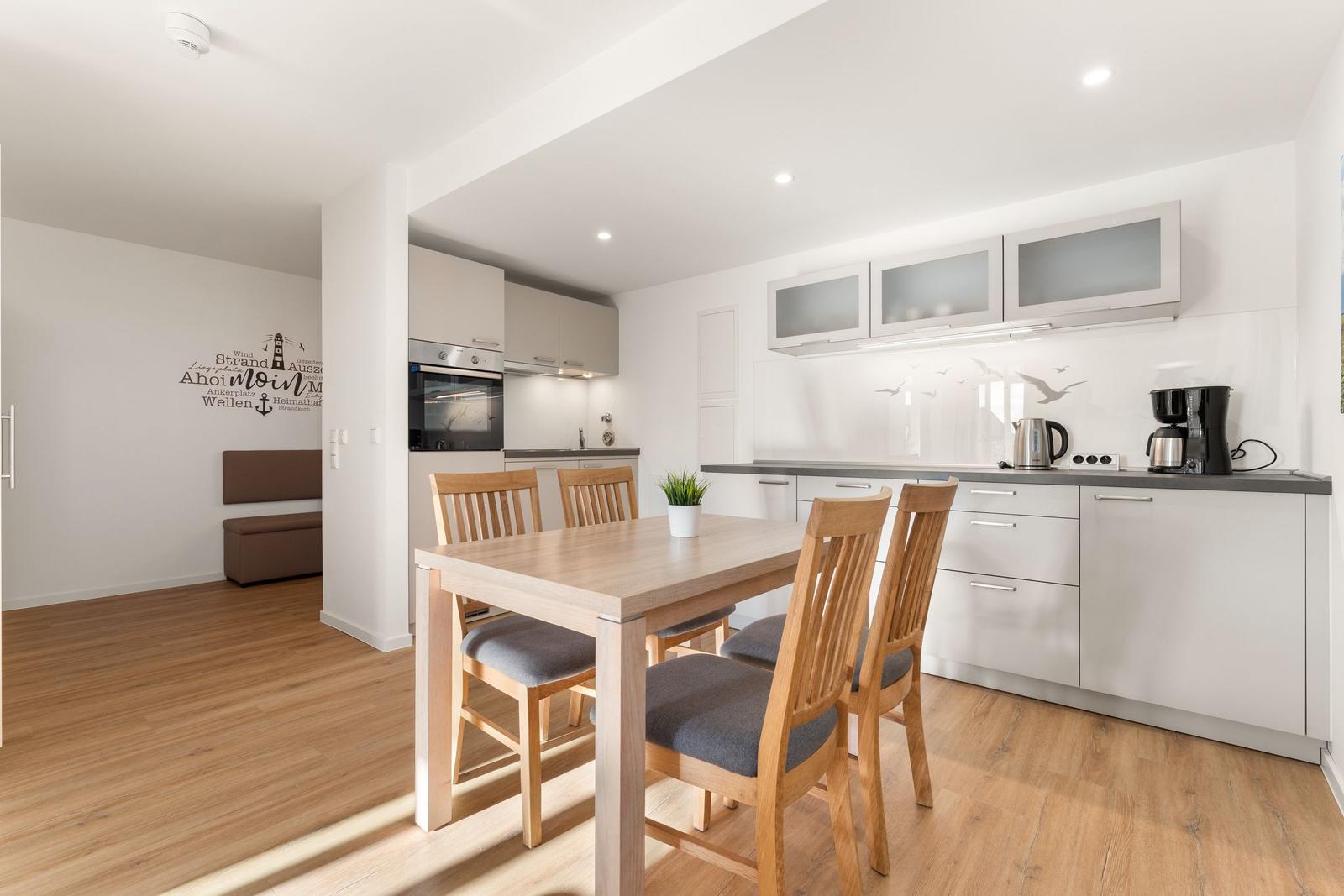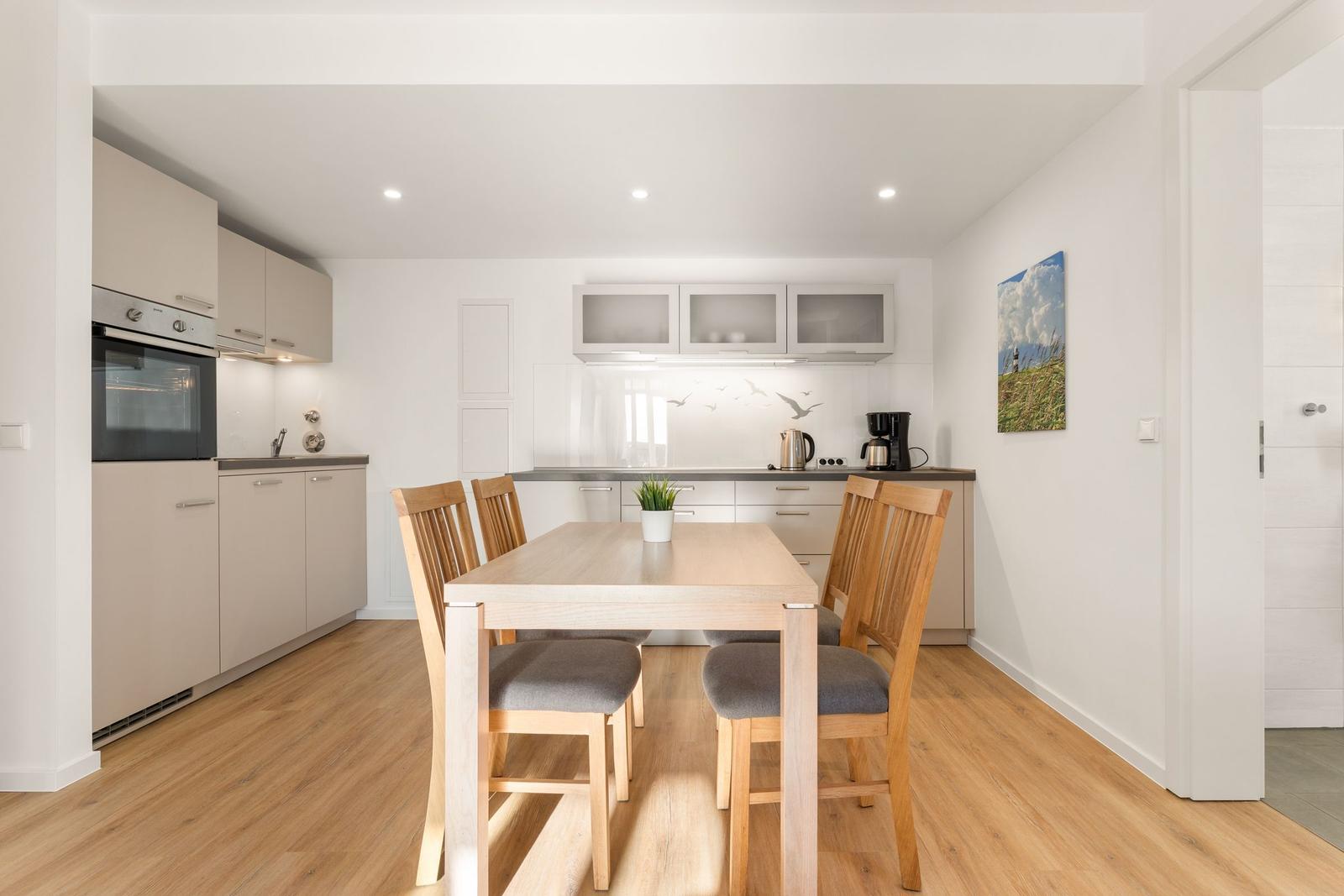 The open kitchen is fully equipped with modern appliances, including a dishwasher, electric/gas stove, oven, refrigerator, coffee machine, toaster, and even an egg cooker, ensuring a pleasant cooking experience. The dining area includes a spacious table, ideal for shared meals.