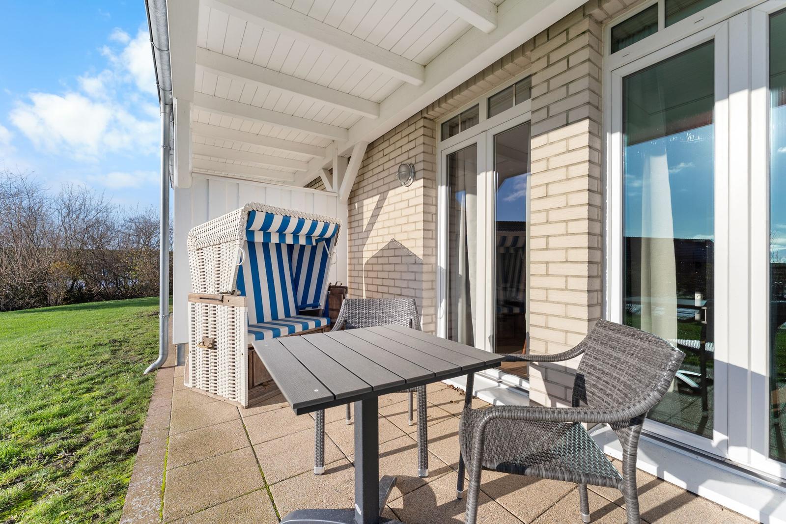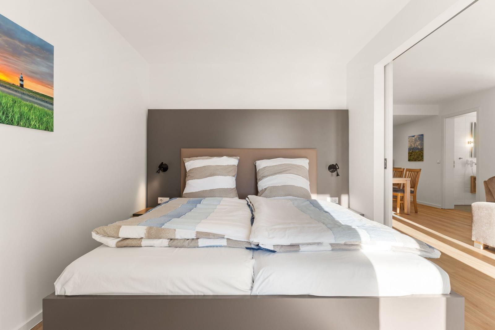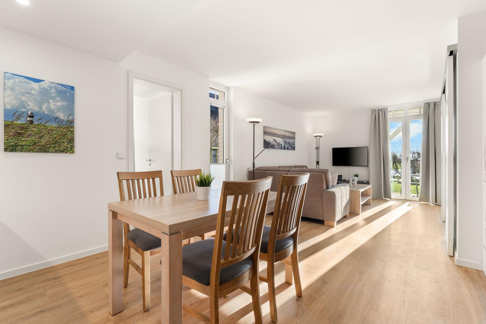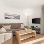 This welcoming vacation apartment is designed for comfort and convenience. It features one bedroom with a spacious double bed (1.80 x 2.00 m) and a cozy living area equipped with a sofa and armchairs, perfect for relaxation.